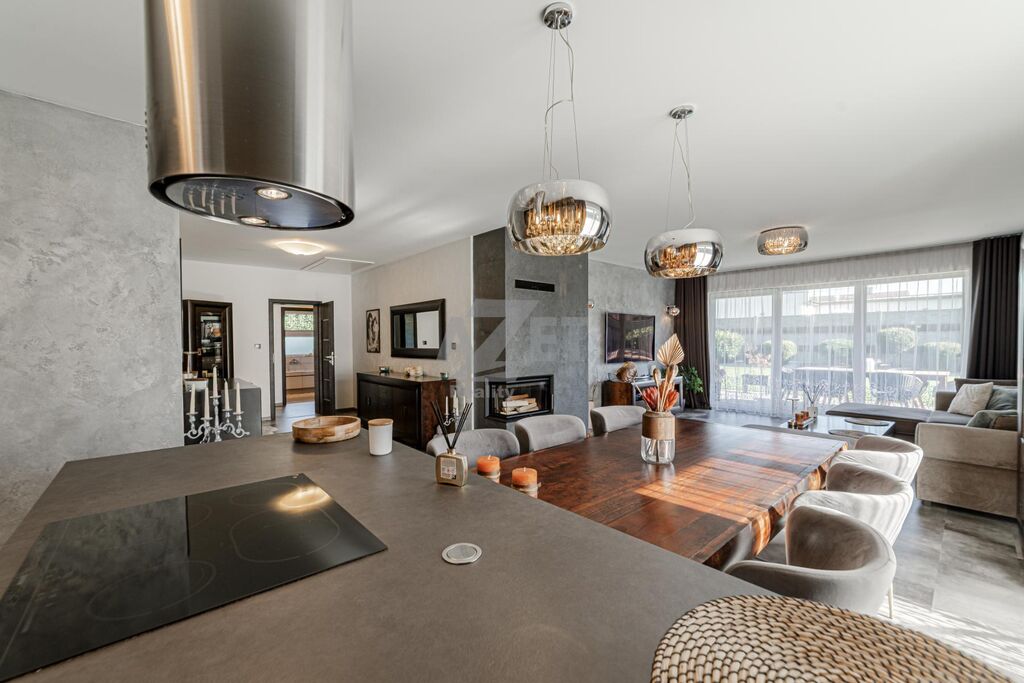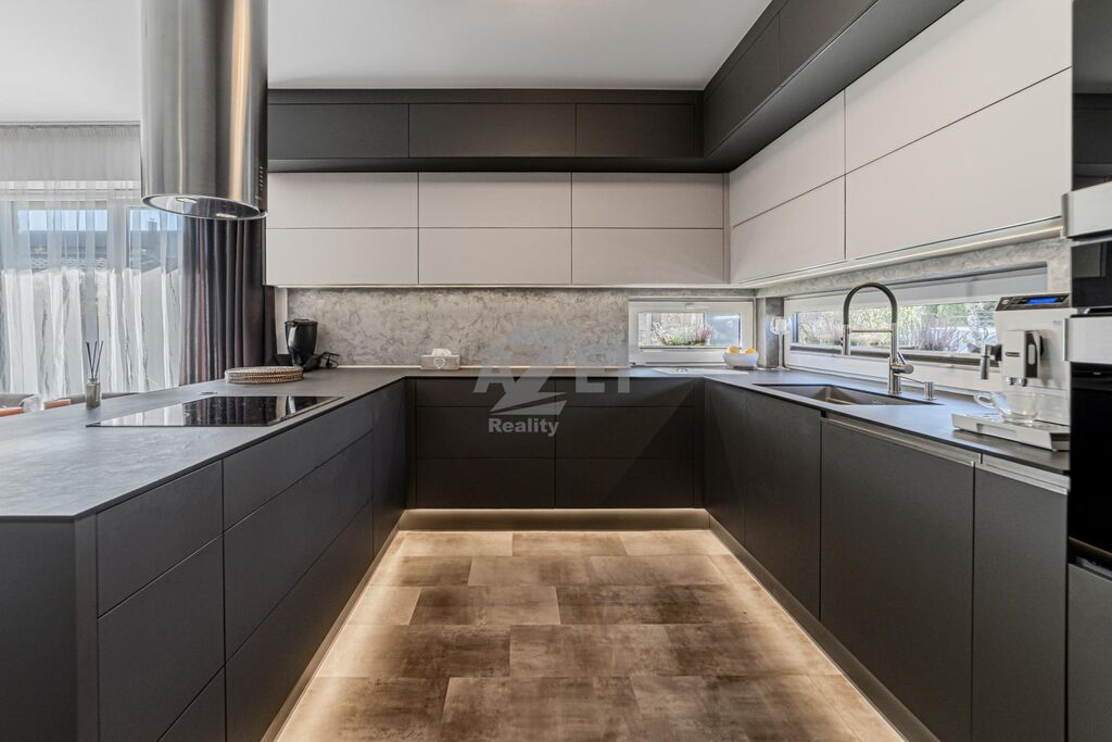 1. NP - V kuchyni otevřené do hlavní obytné místnosti se nachází moderní rohová kuchyňská linka ve tvaru U vyrobená řemeslně na míru, v provedení bílo-šedá, vybavená kvalitními spotřebiči (myčka, lednice, horkovzdušná trouba, sklokeramická varná deska, digestoř). Dominantou obývacího prostoru je krb, který zajišťuje příjemnou atmosféru i tepelný komfort v chladnějších měsících. Z obývací místnosti je přímý vstup na dlážděnou terasu (betonová dlažba) s posezením a výsuvnou pergolou. Z dalších pokojů je vstup přímo na zahradu.