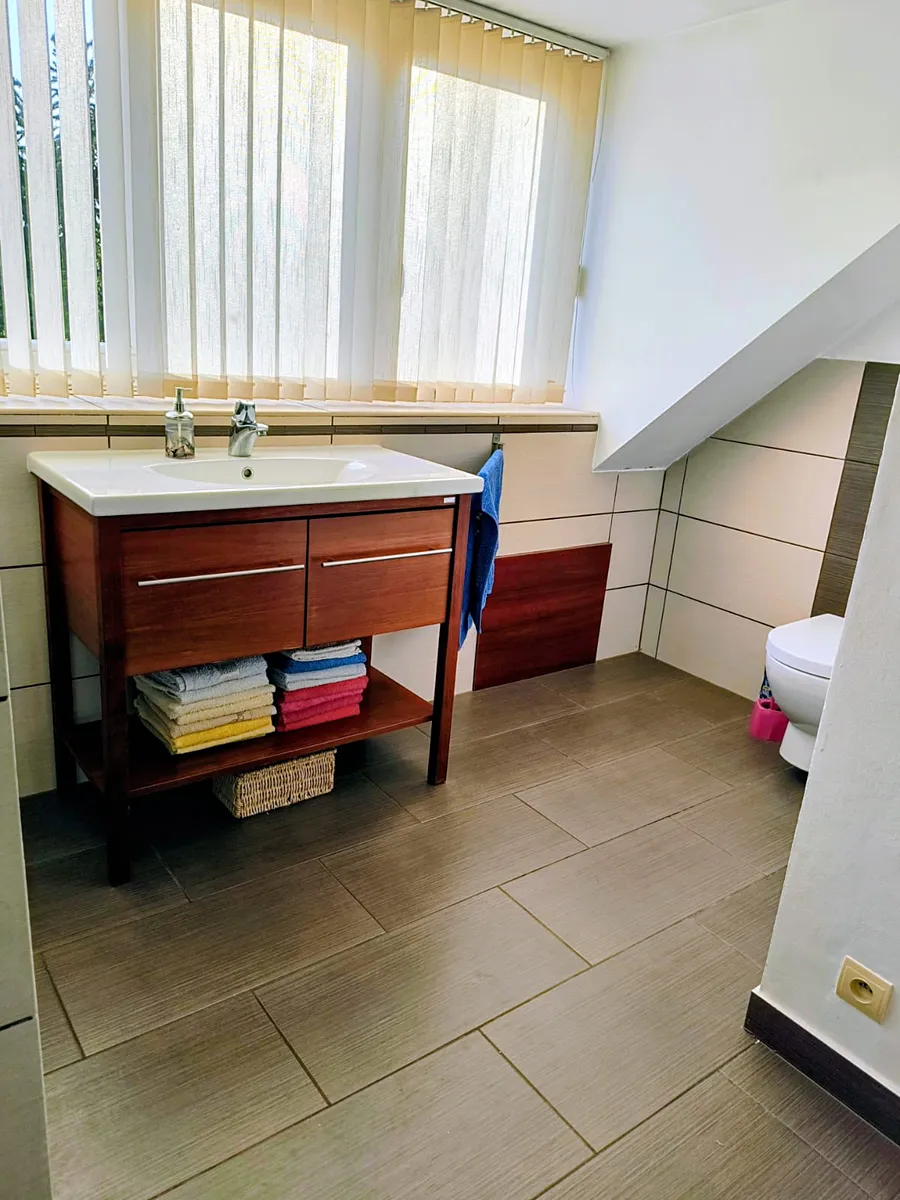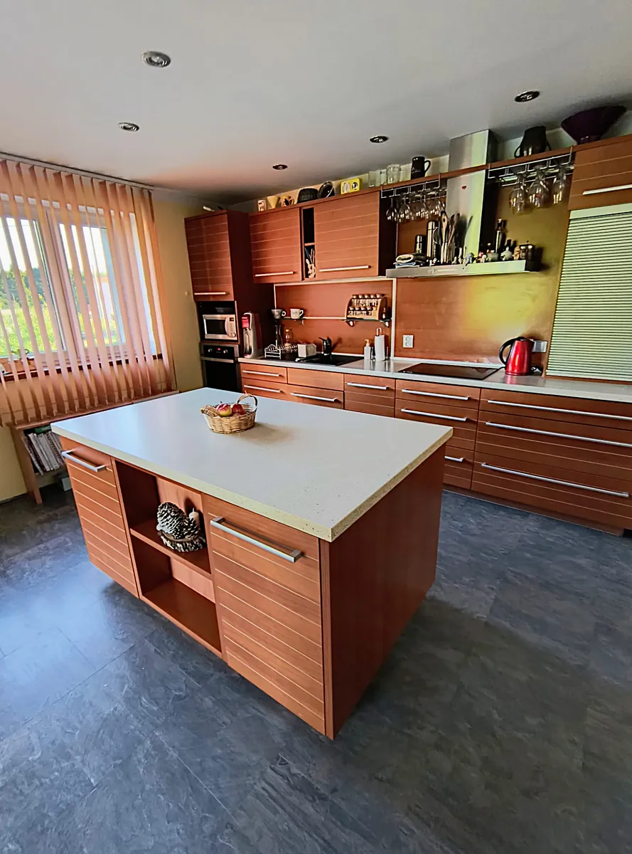 Kuchyňská linka je od výrobce Sikora a i ostatní části jsou vyrobeny z kvalitních materiálů a obkladů.