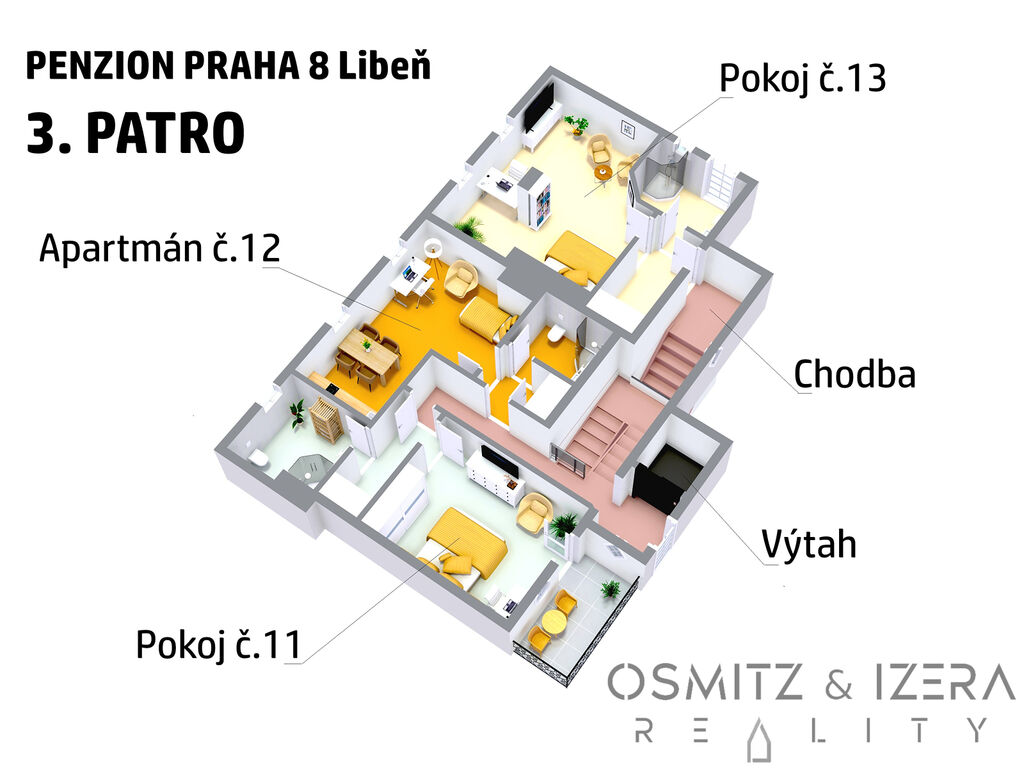 • Nadzemní podlaží: 12 pokojů + 1 apartmán, každý s vlastním sociálním zařízením, 5 pokojů s balkónem.