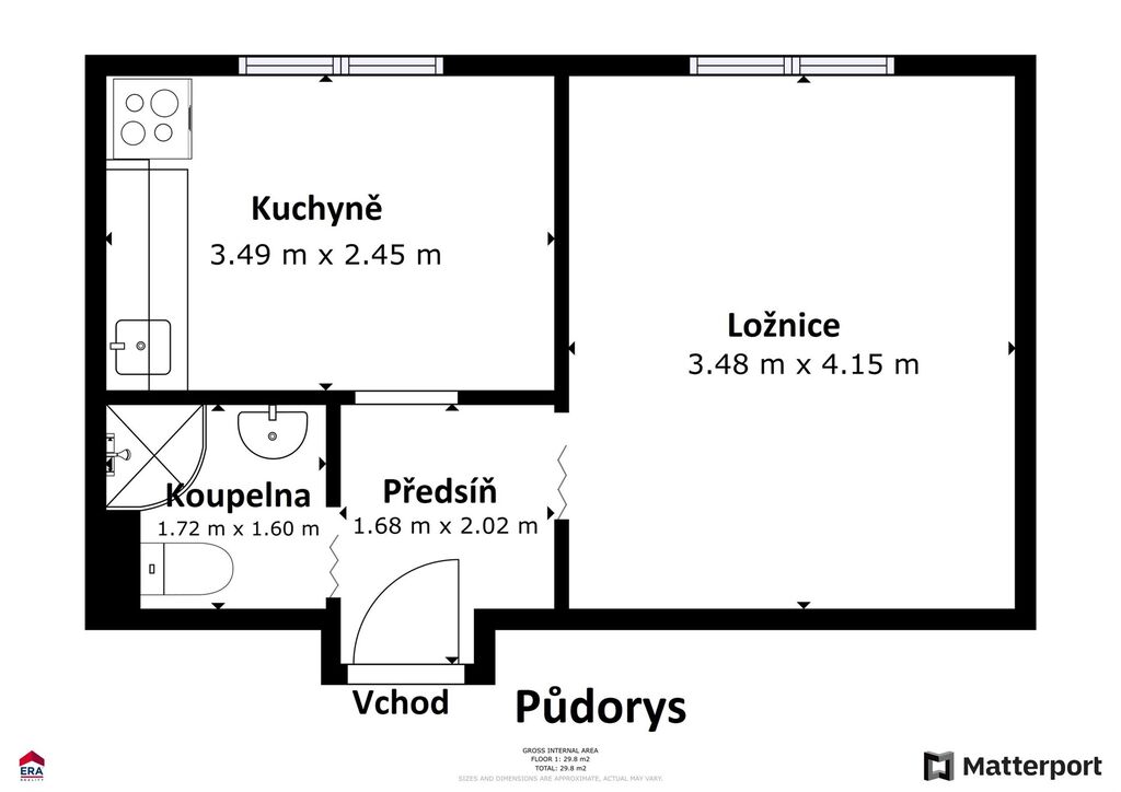 Byt disponuje předsíní, ze které se vchází do koupelny s WC a sprchou, dále pak do obývacího pokoje/ložnice nebo do kuchyně s linkou se sporákem, dřezem a místem pro umístění pračky.