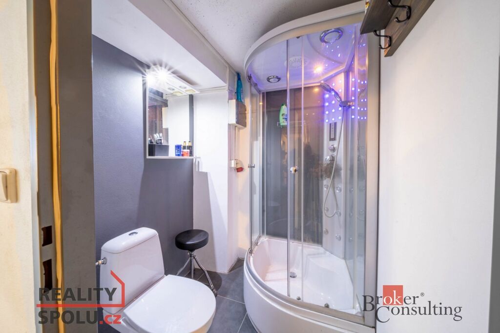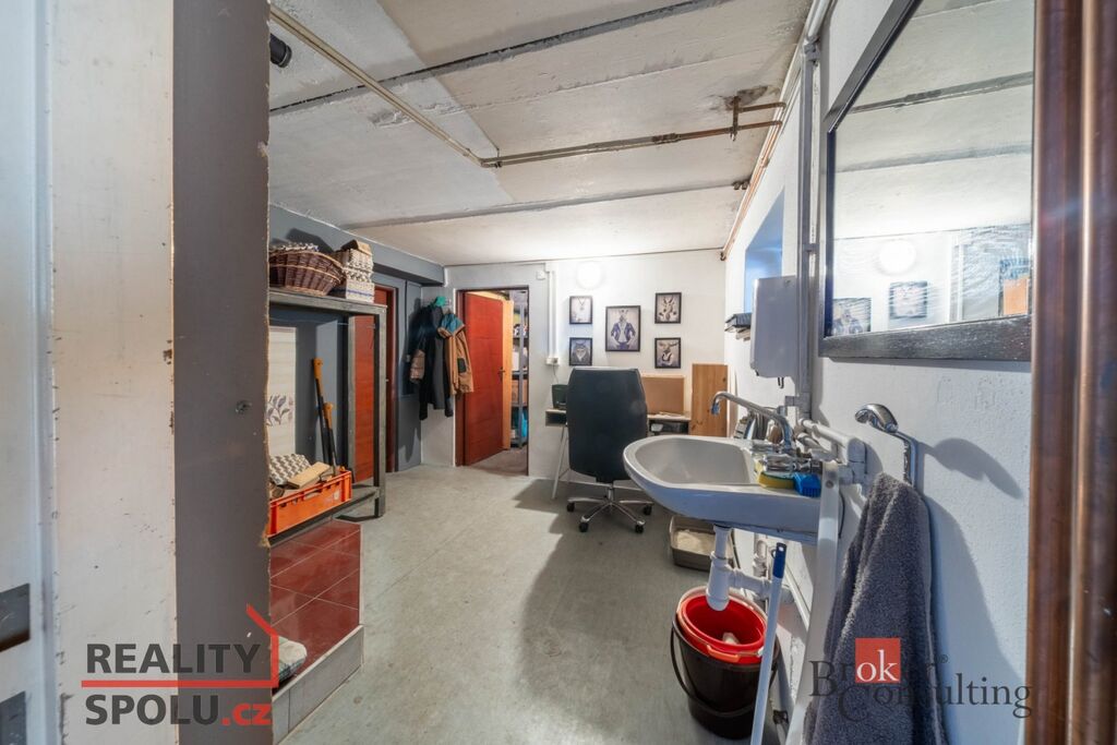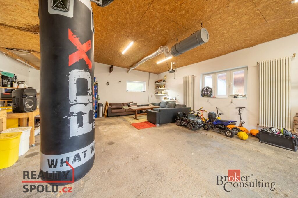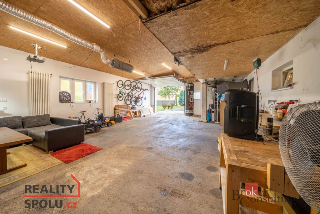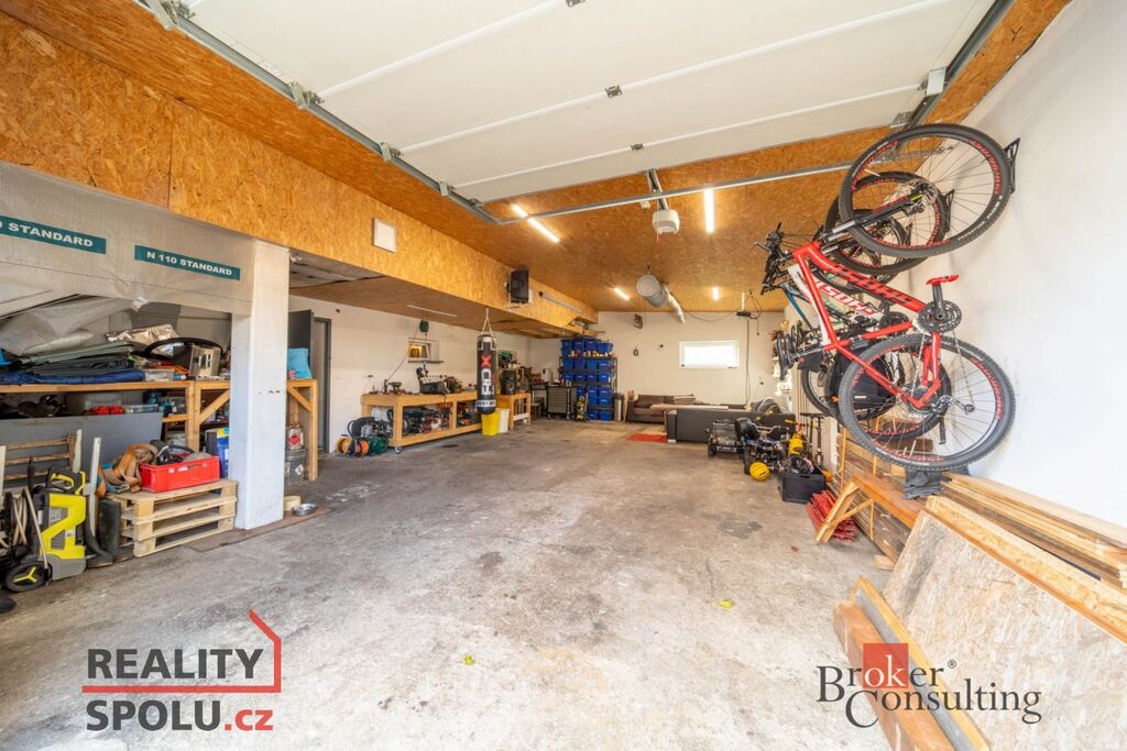 Součástí nabídky je také prostorná garáž/dílna (76 m²) se skladem a vlastní koupelnou s WC.