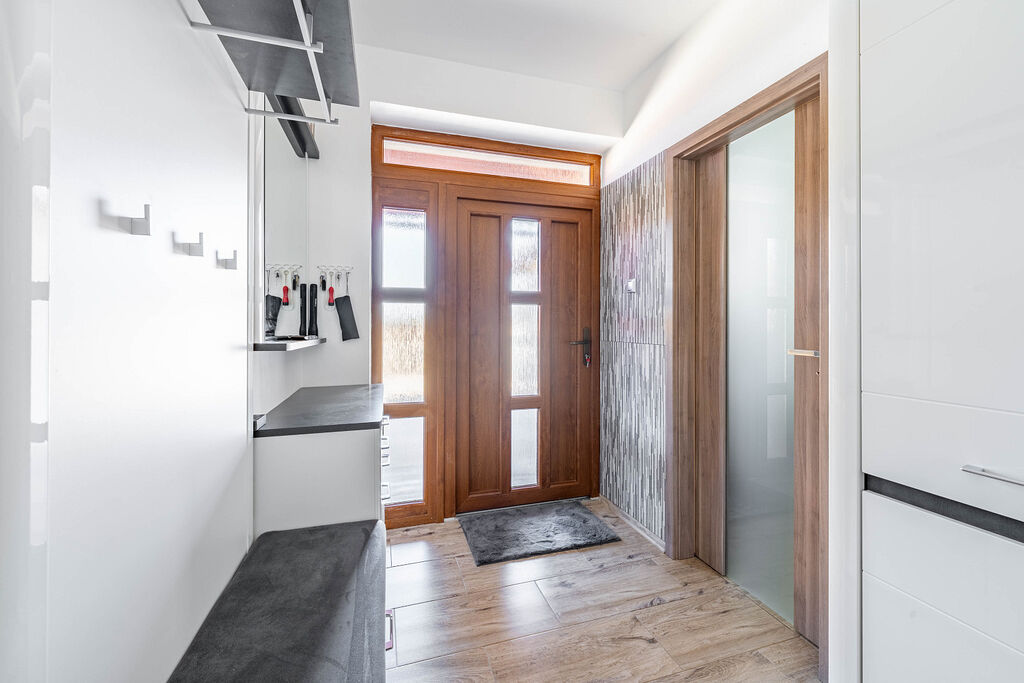 Uvítá vás prostorná předsíň s mnoha úložnými možnostmi a vstupem do technické místnosti, kde se nachází nový kondenzační kotel, pračka, sušička a bojler. Centrální hala se skříněmi na míru propojuje všechny místnosti domu – ložnici, hostinský pokoj, šatnu (kterou lze přeměnit na další pokoj), koupelnu s velkým sprchovým koutem i samostatné WC.