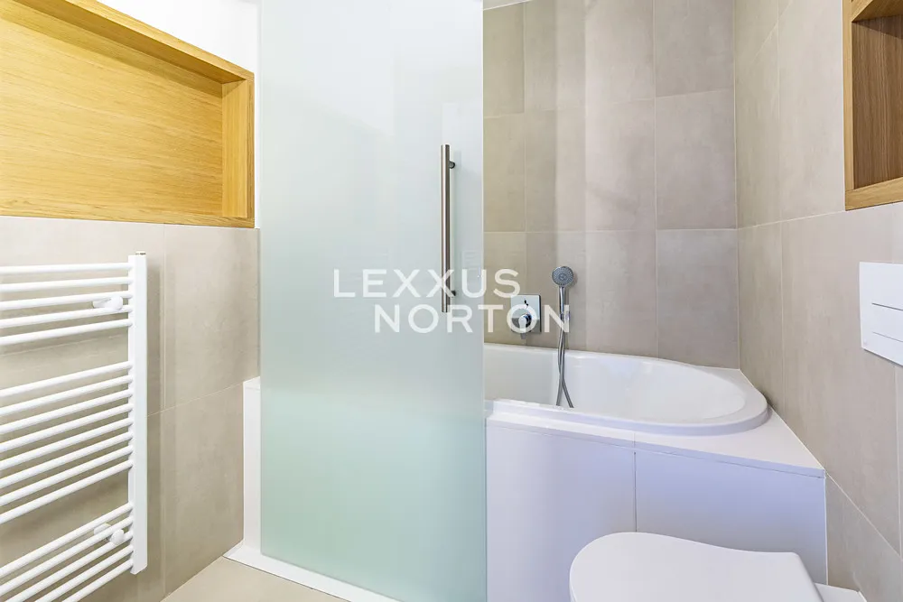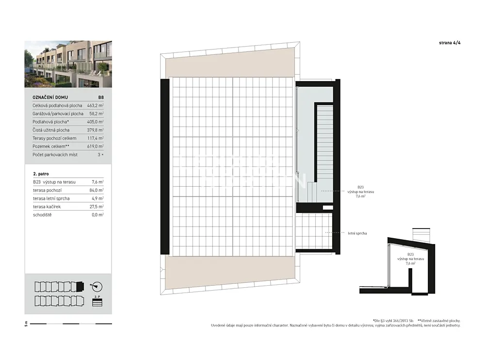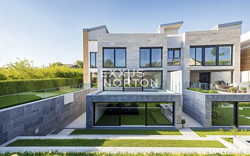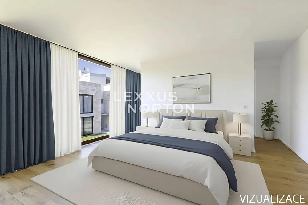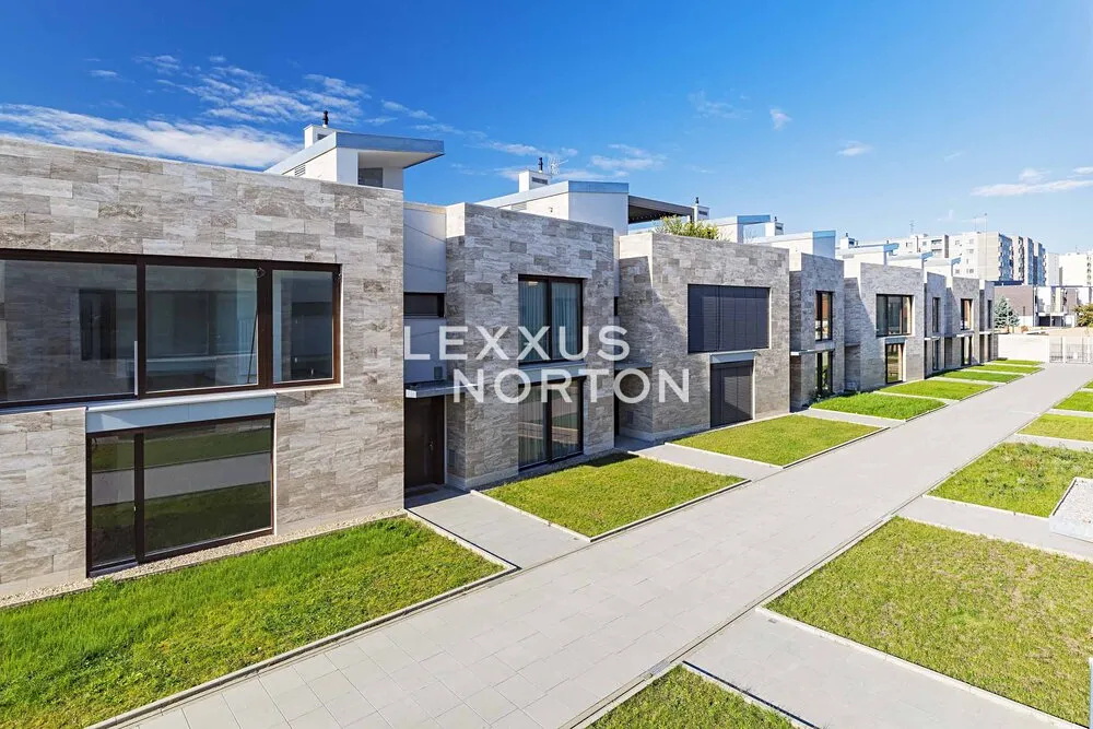 K prodeji nabízíme výjimečnou rodinnou řadovou vilu 6+kk s celkovou podlahovou plochou 405 m² a třemi parkovacími stáními v podzemních garážích. Tento promyšleně navržený dům je ideální pro rodiny hledající maximální komfort a flexibilitu prostoru. Přízemí domu nabízí velkorysý obývací prostor s přípravou pro kuchyňský kout (70,6 m²) s přímým výstupem na terasu s výhledem do zahrady. V přízemí je dále k dispozici pokoj pro hosty s vlastní koupelnou, který může sloužit také jako pracovna a další samostatná koupelna s toaletou. První patro disponuje hlavní ložnicí 18,5 m² s vlastní koupelnou a šatnou, 2 prostornými ložnicemi (18,5 m², 19,6 m²) s vlastními koupelnami a další samostatnou šatnou. Korunou domu je krásná střešní terasa 84 m² s výhledy do okolní zástavby a zeleně, kterou lze využívat celoročně.