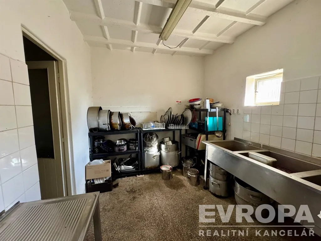 Prostory zahrnují kuchyni, mrazák 4m2, umývárnu, sklady, sklep, sociální zařízení, šatnu a komoru na úklid.