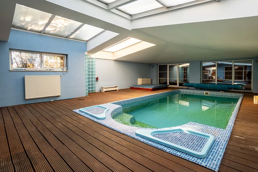 Nabízená nemovitost je samostatně stojící objekt rodinného domu, podsklepený, s jedním nadzemním podlažím a podkrovím. Je zděný, střecha je sklonitá s krytinou z betonové tašky, bleskosvod je instalován, klempířské prvky jsou z měděného a pozinkovaného plechu. Fasáda je zakázková, drásaná. Okna jsou plastová, vnitřní dveře jsou plné a prosklené, do obložkových zárubní, podlahy jsou z dlažby, koberců a laminátu. WC jsou splachovací, koupelny s vanami, sprchové kouty, umyvadla. Vybavení kuchyně je s linkou, varná deska, spotřebiče, Mezi další vybavení domu patří: klimatizace, pohybový alarm, vestavěné skříně, krb, digestoř, sauna, whirpool, bazén vnitřní, ochlazovací bazén, tepelné čerpadlo. V domě je zavedena elektřina o napětí 230V a 400V a je napojen na rozvodnou síť elektrického proudu. Zdrojem vody je vodovod, má připojení na veřejnou kanalizaci a rozvod zemního plynu je připojen. Řešení vytápění v domě: plynový kotel, tepelné čerpadlo země-voda (zemní vrty) a topná tělesa tvoří závěsné radiátory. V domě je instalováno tepelné čerpadlo na ohřev vody. Schody jsou betonové s povrchem z laminátu.