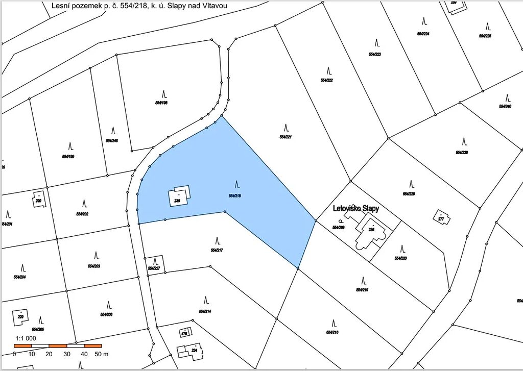 Jedná se o lesní pozemek v rekreační lokalitě Na vyhlídce, obec Slapy, na řece Vltavě, uprostřed pozemku se nachází rodinný dům č. p. 198, který je součástí p. č. st. 235, k. ú. Slapy nad Vltavou (jiný vlastník). Dle Lesního hospodářského plánu se jedná o les hospodářský, převažuje však rekreační funkce lesa nad produkční. Užívání nezbytného okolí rodinného domu č. p. 198 je ošetřeno nájemní smlouvou do 31. 12. 2028. Pozemek je historicky oplocen, přístupný kovovou bránou, uzamčen. V pozemku jsou uloženy inženýrské sítě (vodovod, přípojka NN, jímka), sloužící rodinnému domu Slapy č. p. 198, které nejsou smluvně ošetřeny věcným břemenem, rovněž přístup k výše uvedenému rodinnému domu není smluvně ošetřen, předpoklad vymezení rozsahu věcných břemen viz GP č. 591-108/2022. Obec Slapy nemá schválen nový územní plán, v současné době není pozemek zastavitelný.