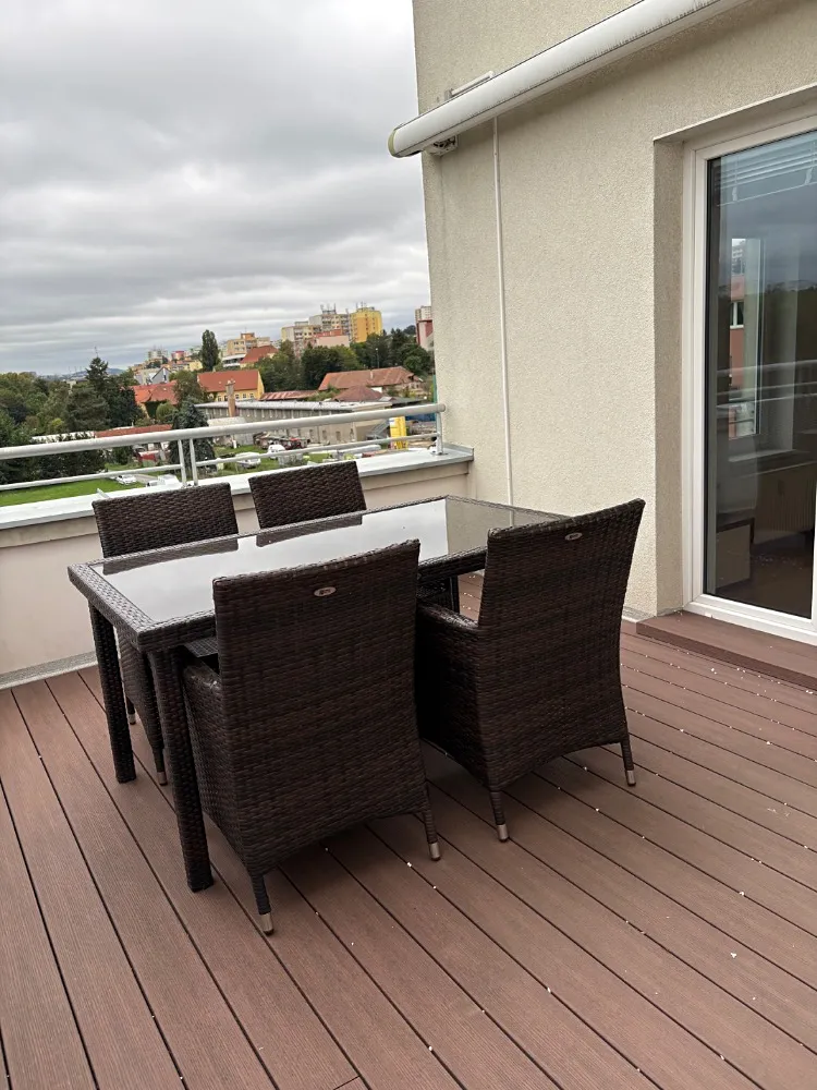 Nabízíme k pronájmu velmi pěkný, částečně zařízený byt s prostornou terasou a výhledem na přírodní park Hostivař. Dispozičně je byt řešený jako 3+kk s dostatkem úložných prostor. Kuchyňská linka vybavena spotřebiči, žaluzie, markýza na terase. Koupelna s vanou, 2x toaleta. Samostatný vstup do ložnic, přičemž jedna má balkon. Vstup na terasu jak z obývací části, tak z kuchyně. Součástí bytu je parkovací stání v podzemní garáži za 2000Kč/měsíc. V okolí veškerá občanská vybavenost a dobrá dostupnost do centra města.