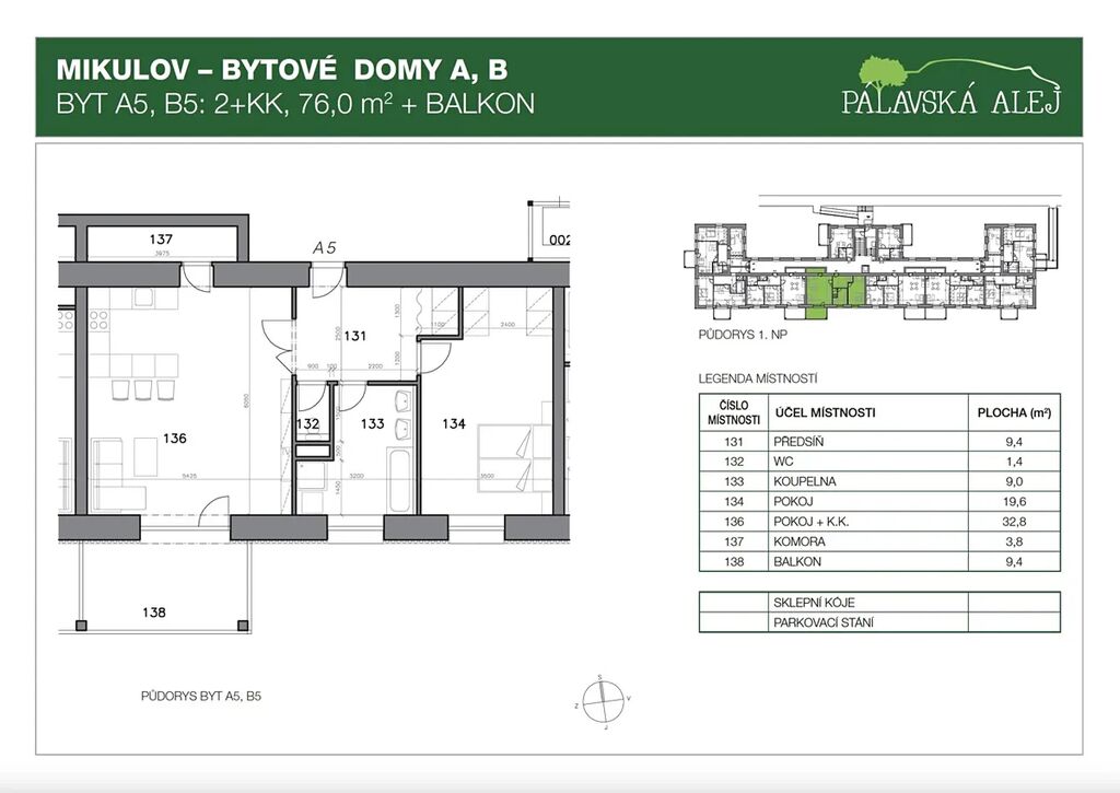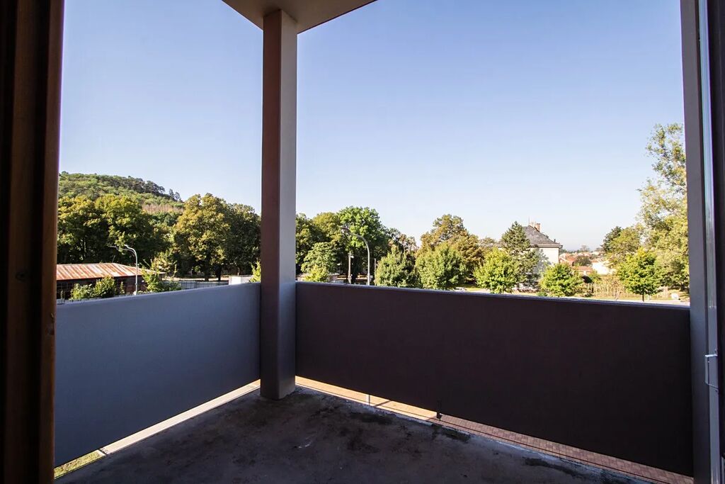 Nachází se v přízemí bytového domu s výtahem v Pálavské aleji. Byt má prostornou a vzdušnou hlavní místnost s kuchyňským zázemím, velká okna a přímý vstup na balkón o rozloze 9,5m2.