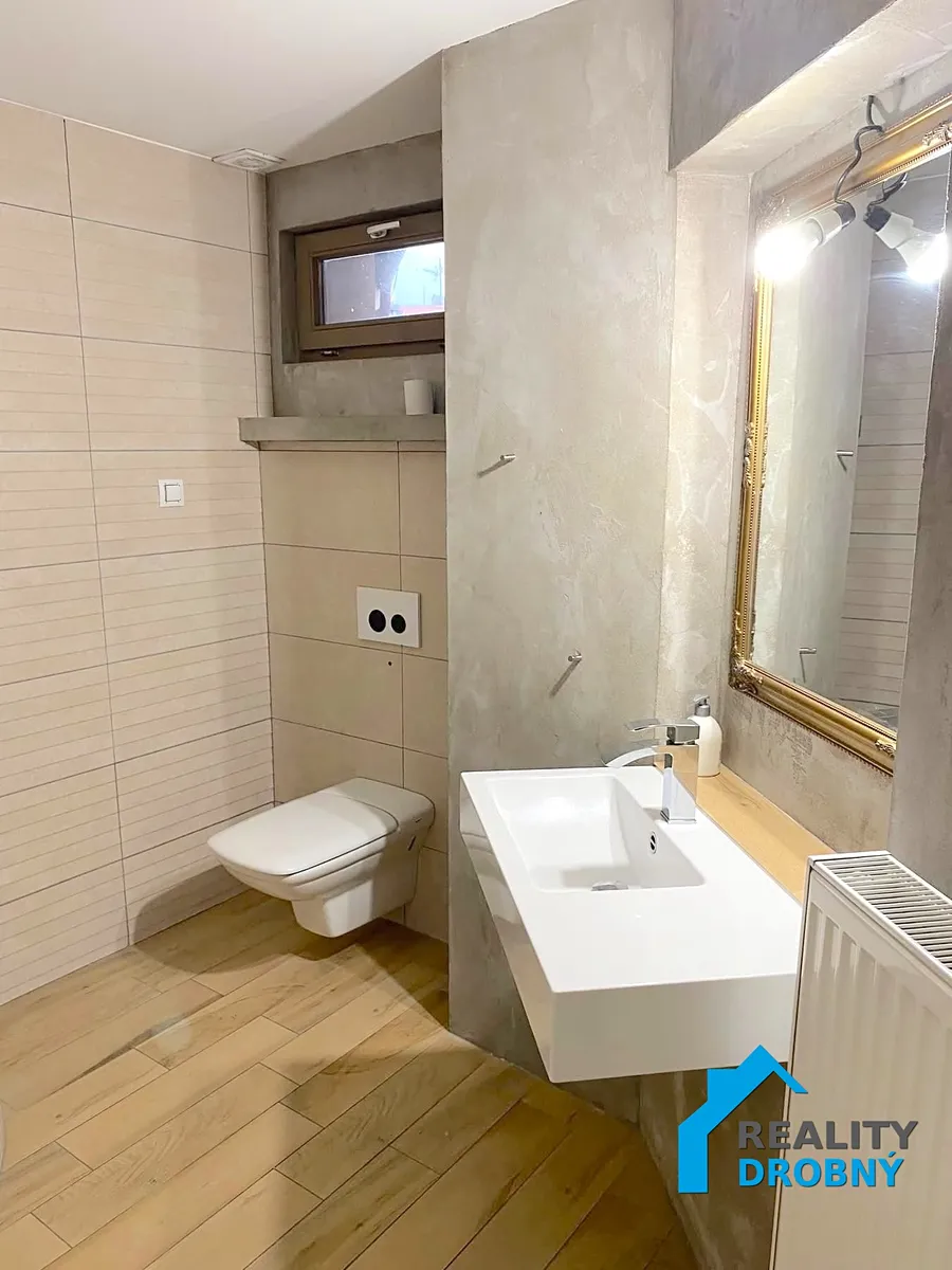 Byt je po kompletní rekonstrukci - nové rozvody (vody, topení a elektřiny), nová kuchyňská linka na míru s plynovou varnou deskou, digestoří, s vestavěnou troubou, myčkou, lednicí a mrazákem, betonová stěrka. V koupelně je vana, umyvadlo, zrcadlo, vestavěná toaleta, obklady a dlažba. Vytápění vlastním plynovým kotlem. Nad obývacím pokojem je vytvořen snížený mezonet o velikosti cca 9m2 , kde je úložný prostor a možnost spaní. Přístup po žebříku. Prostorná chodba. K bytu patří půdní koje a sklep.