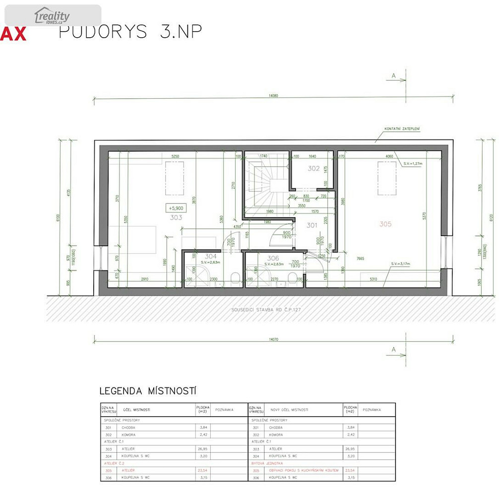 Ateliér o výměře 30,15 m² - obývací pokoj s kuchyňským koutem a koupelna s WC.