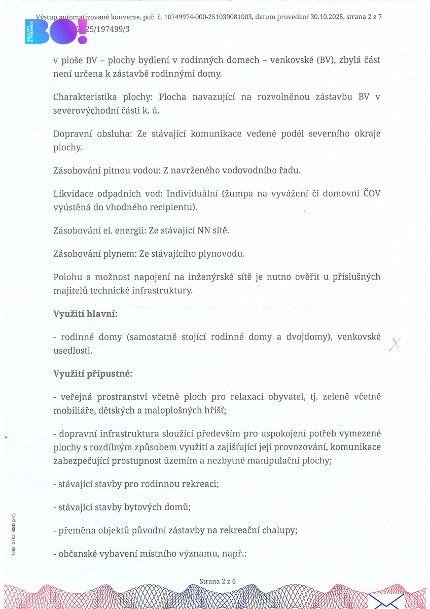 Okolní zástavba: má převážně rezidenční charakter – jedná se o rodinné domy a novostavby, které harmonicky zapadají do krajiny. Charakter lokality umožňuje realizovat různé architektonické styly – od klasických domů venkovského typu až po moderní minimalistické stavby, které využijí potenciál otevřeného prostoru a výhledu do přírody.