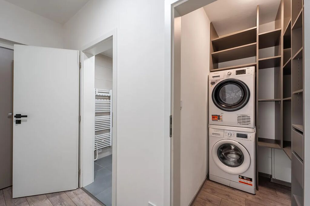 Byt disponuje vstupní chodbou, ze které se jde do koupelny, šatny a hlavní obytné místnosti. Koupelna je vybavena moderním sprchovým koutem a toaletou. Šatna/technická místnost poskytuje bohaté a promyšlené úložné prostory včetně vyhrazeného místa pro pračku se sušičkou (spotřebiče nejsou součástí vybavení). Hlavní obytná místnost nabízí chytré designové řešení pro oddělení spací zóny od kuchyně a obývacího prostoru. Moderní kuchyňská linka je plně vybavena (indukční varnou deskou, troubou s funkcí mikrovlnky a myčkou nádobí).