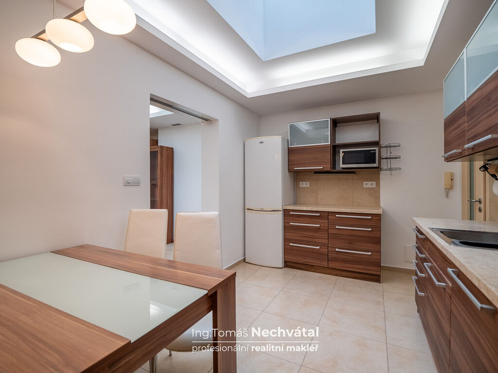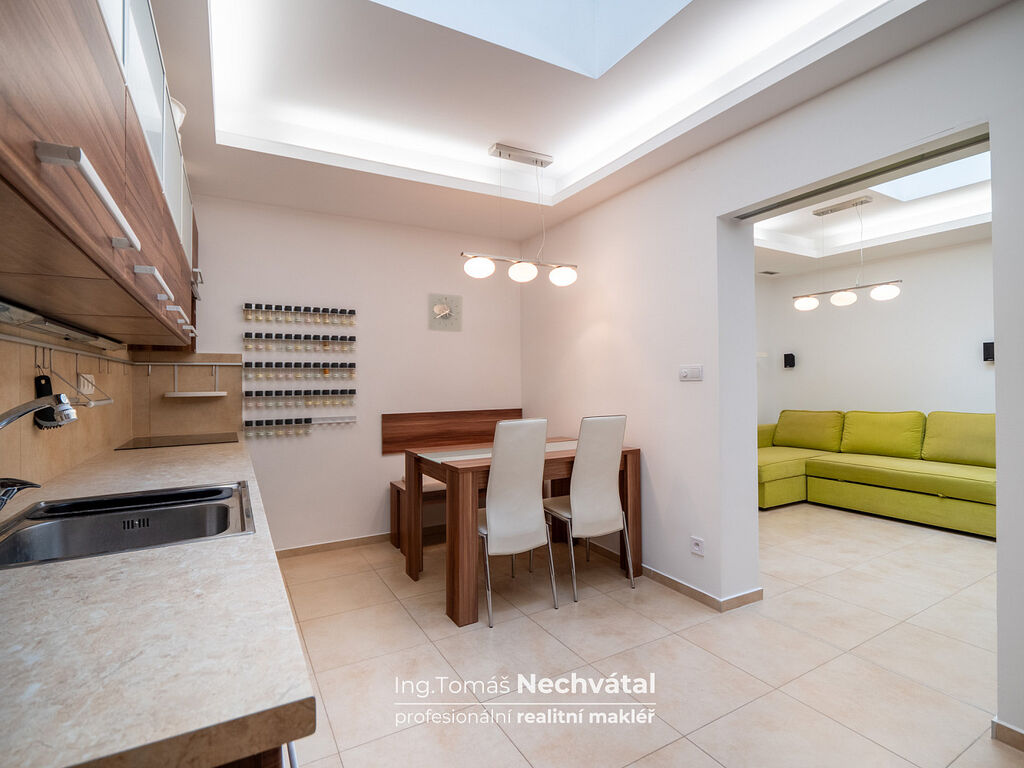 Dostatek denního světla zajišťují dvě velká střešní okna. O vytápění se stará plynový kotel s podlahovým topením, které zaručuje příjemnou teplotu a nízké provozní náklady.