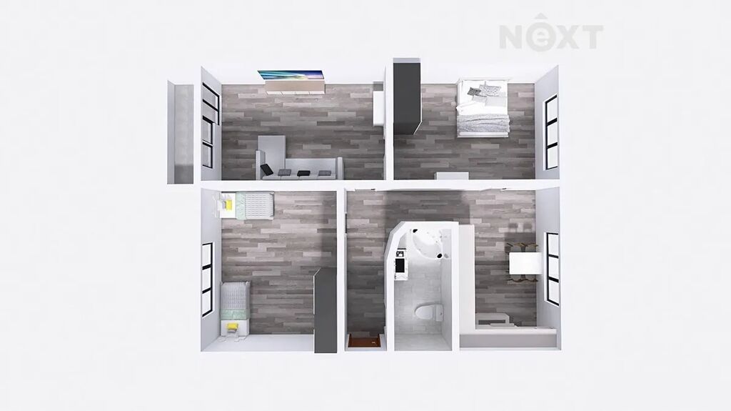 Dispozice bytu je praktická a umožňuje široké možnosti úprav. Po vstupu do bytu se nachází prostorná chodba s dostatkem úložného prostoru, koupelna s vanou, samostatné WC a tři neprůchozí pokoje, které zajišťují naprosté soukromí.