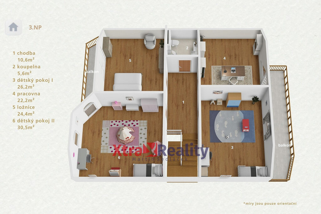 Pokud vystoupáme do 3. nadzemního podlaží, ocitneme se v chodbě, ze které se dostaneme do 2 dětských pokojů, ložnice se vstupem na balkón, pracovny a koupelny s umyvadlem, WC a sprchovým koutem.