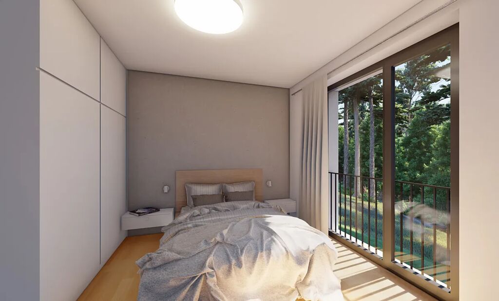 1. podzemní podlaží (1. P.P): dvě ložnice s vlastními šatnami, koupelna s WC a další terasa orientovaná na jihovýchod do zahrady s výhledem na les.