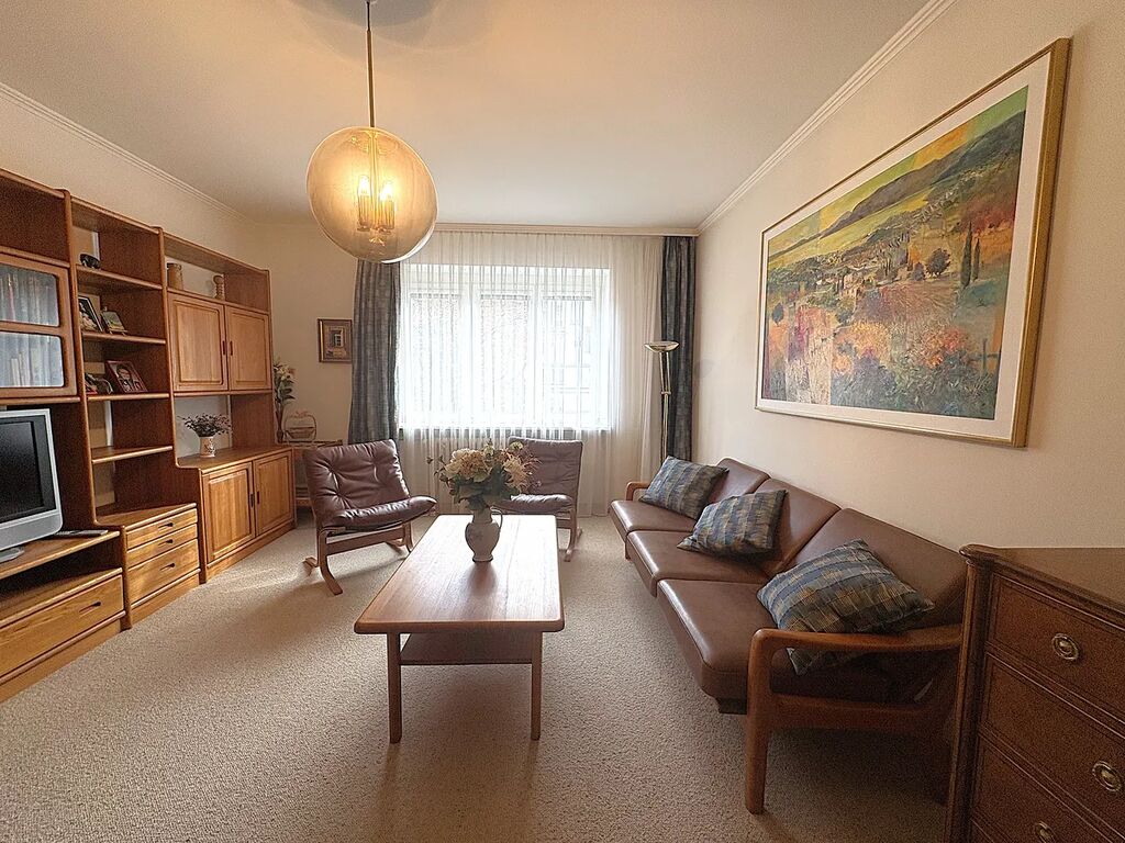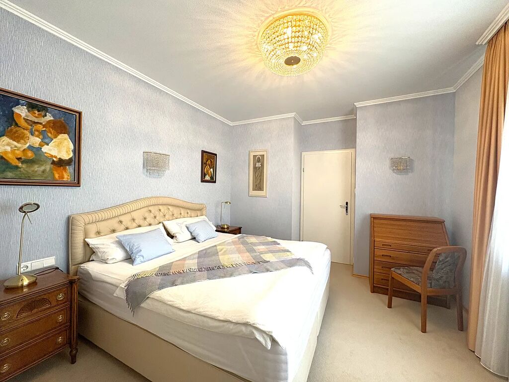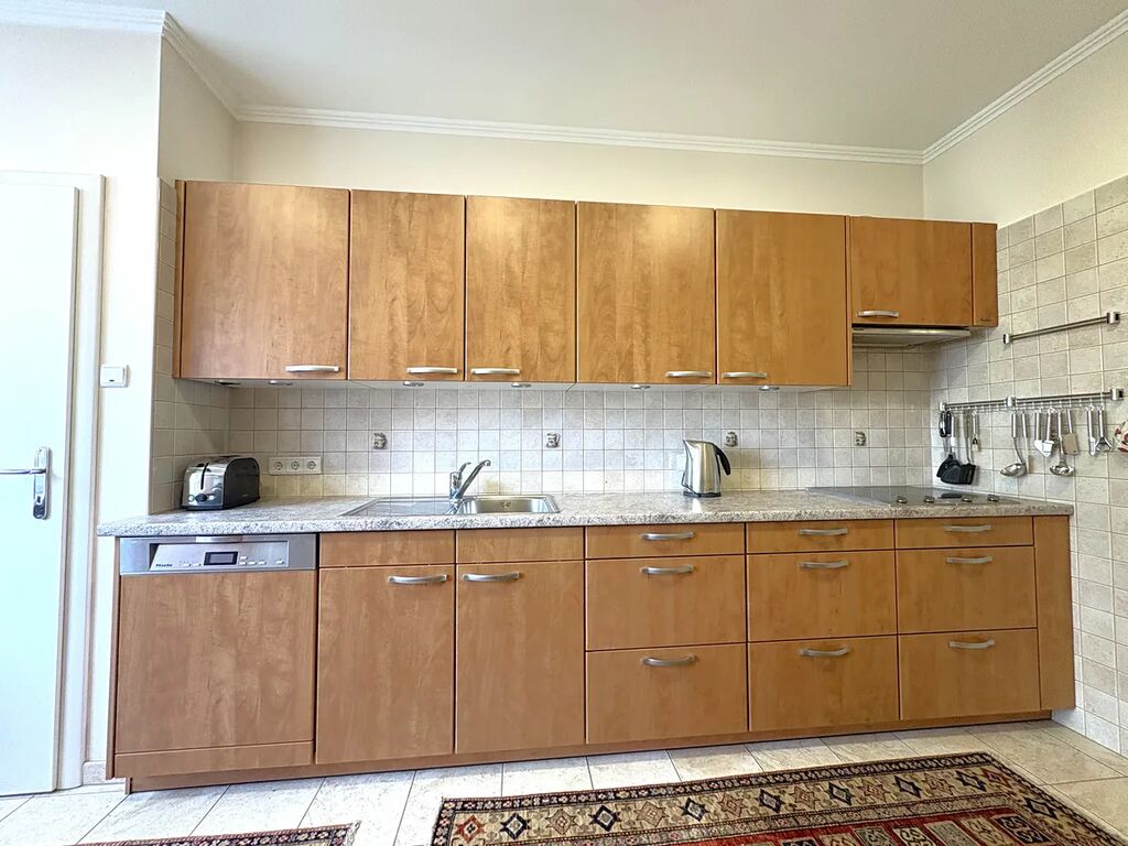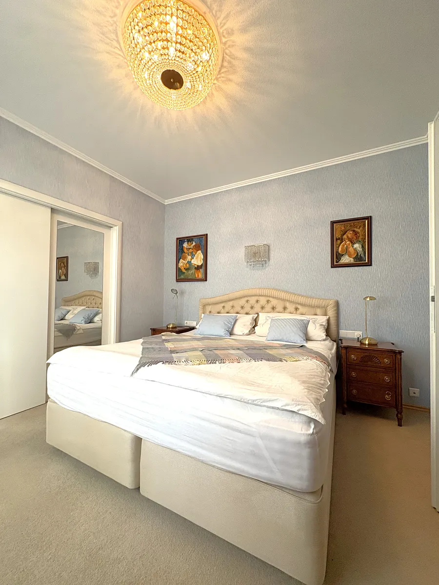 V bytě je kompletně vybavená kuchyně spotřebiči Miele s praktickou špajzkou a jídelna s oknem v centrální hale bytu. Dále velký obývací pokoj, dvě neprůchozí ložnice a v jedné z nich je vstup do prostorné a policemi vybavené šatny. Koupelna je s vanou a WC je zvlášť. V bytě je ještě další komora přístupná z haly. K bytu patří sklep v suterénu domu.