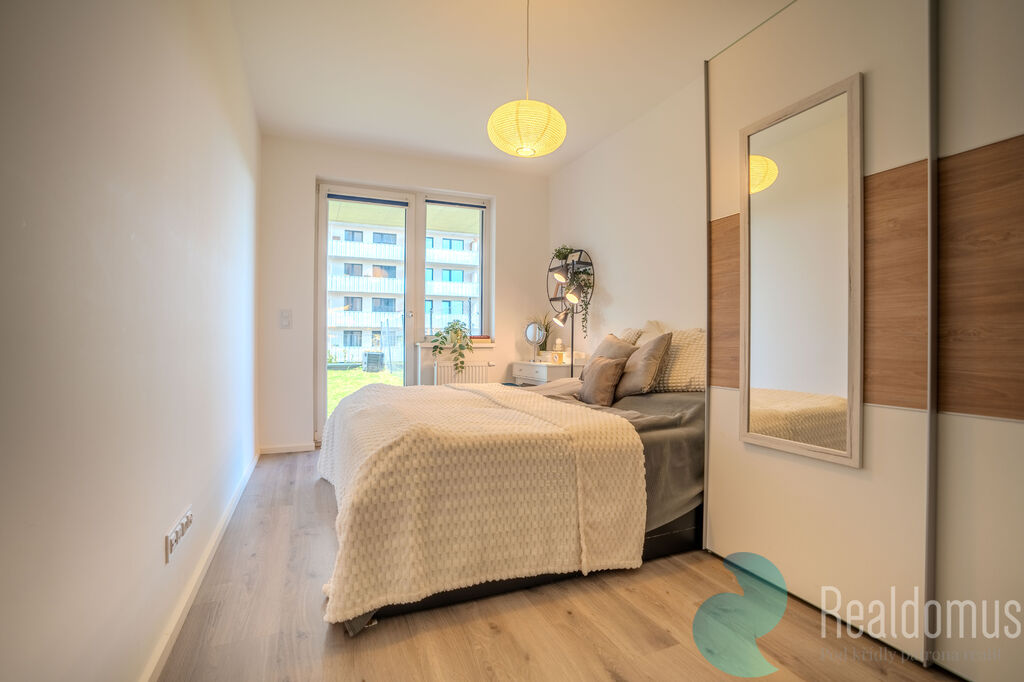 REALDOMUS zprostředkuje prodej světlého a útulného bytu o dispozici 2+kk s užitnou plochou 60 m², který se nachází v přízemí moderní rezidence dokončené v roce 2017 v oblíbené pražské čtvrti Strašnice.