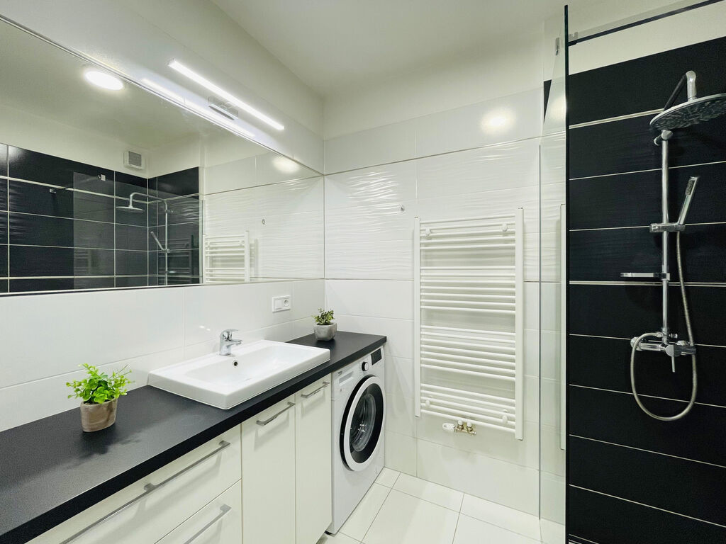 Hlavní obytný prostor tvoří světlý obývací pokoj s designovou kuchyní, která má vše, co potřebujete – vestavěnou myčku, troubu, mikrovlnku, indukční desku i lednici s mrazákem. Dominantou je stylový kuchyňský ostrůvek, který se stane nejen praktickým pracovním prostorem, ale i místem, kde si rádi posedíte u sklenky vína po práci.