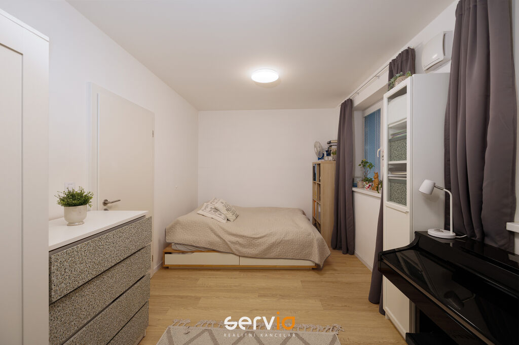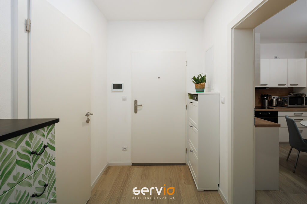 Vybavení bytu: Kuchyňská linka včetně zabudovaných spotřebičů (sklokeramická deska, el. trouba, lednice, myčka), klimatizace. Vytápění zajišťuje plynový kotel. Možnost parkování před domem.