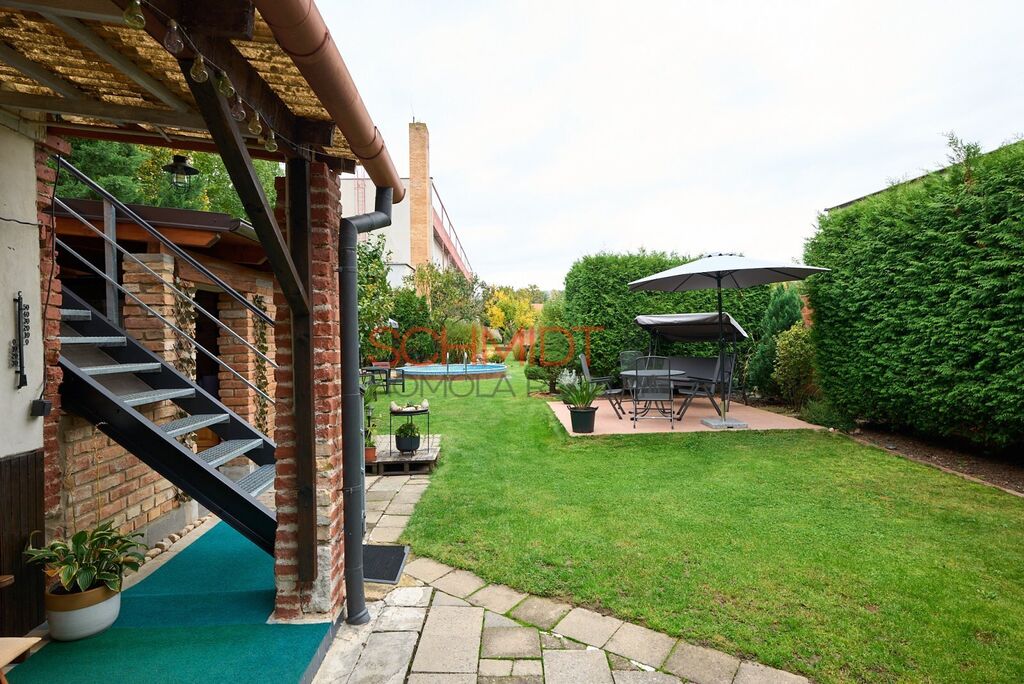 Bazén, kryté posezení, ovocné stromy, to je jen slabý výčet toho, co vše rovinatá a udržovaná zahrada nabízí. Pozemek má celkovou výměru 933 m², z toho zastavěná plocha domem činí 197 m².