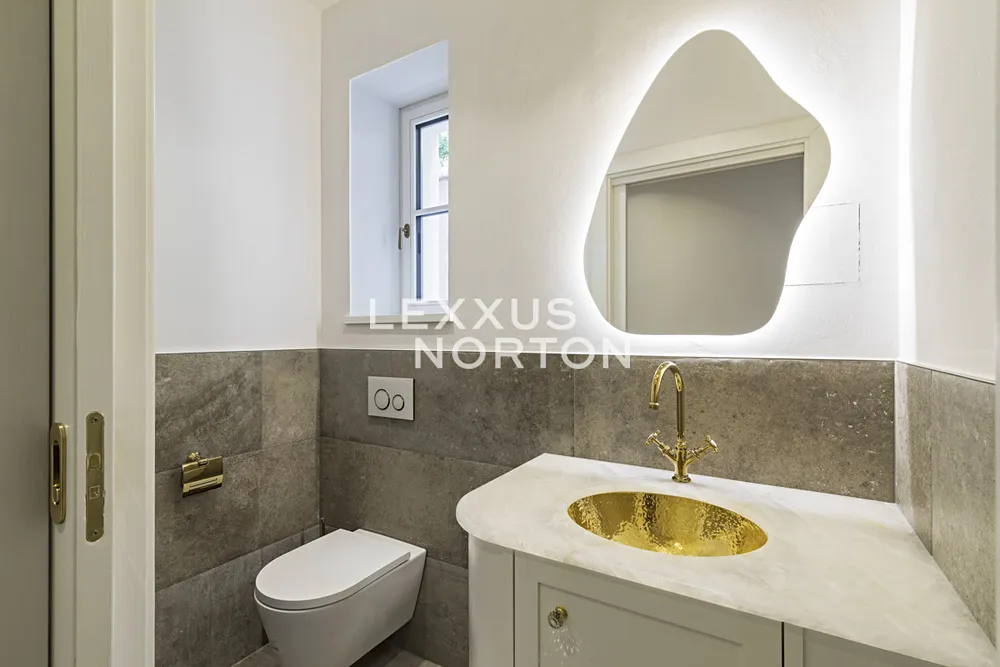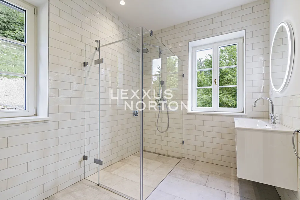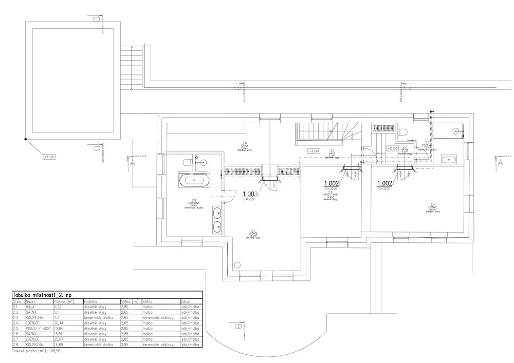 V horním patře se nachází hlavní ložnice s vestavěnými skříněmi a vlastní koupelnou (sprchový kout, vana, toaleta), ložnice s vestavěnou skříní a vlastní koupelnou (sprchový kout, toaleta), další ložnice, chodba s vestavěnými skříněmi, prádelna a přístup na můstek vedoucí do zahrady.