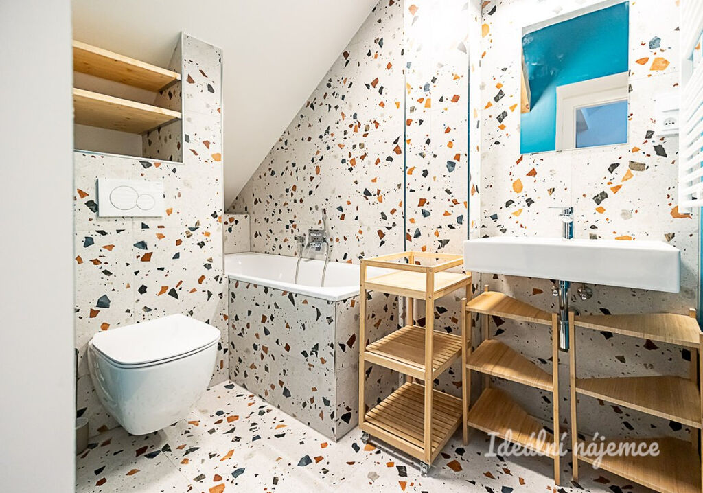 Byt je částečně vybavený, což dává novému nájemníkovi možnost doladit interiér podle vlastního vkusu. Kuchyňský kout je vybaven elektrickou a mikrovlnnou troubou, indukční varnou deskou, digestoří, myčkou a posezením. Obytná část nabízí pohodlný gauč, konferenční stolek a úložné prostory. V horní části bytu se nachází útulná ložnice s postelí a místem pro relaxaci. Koupelna je zařízena vanou, umyvadlem, toaletou a pračkou.
