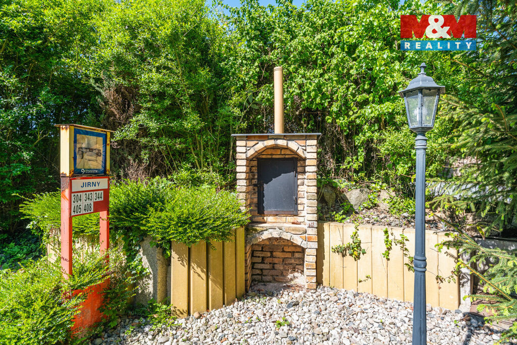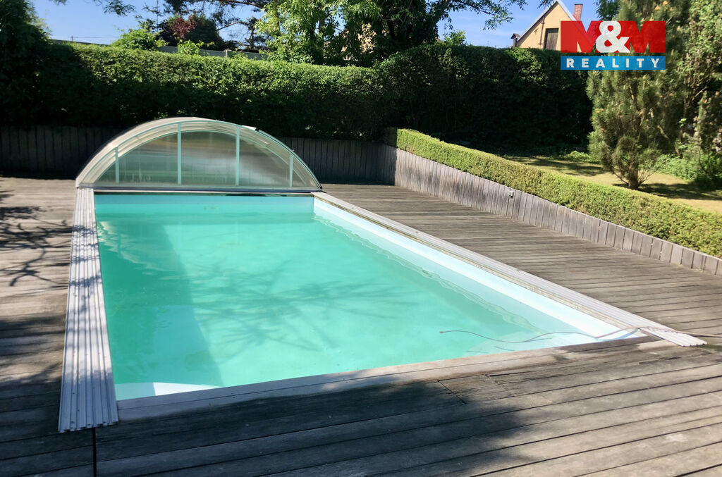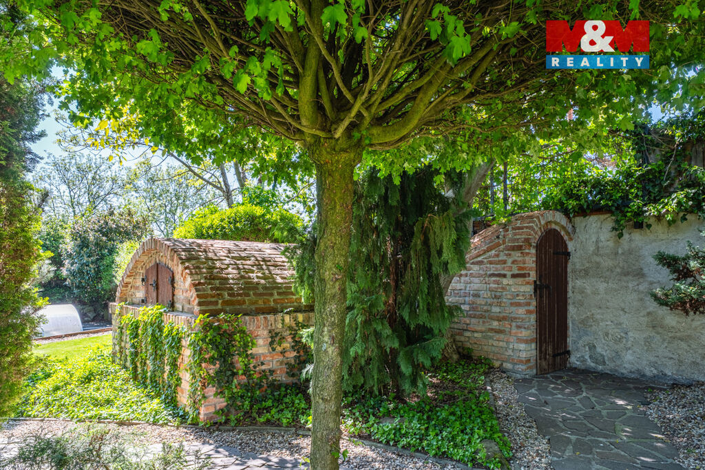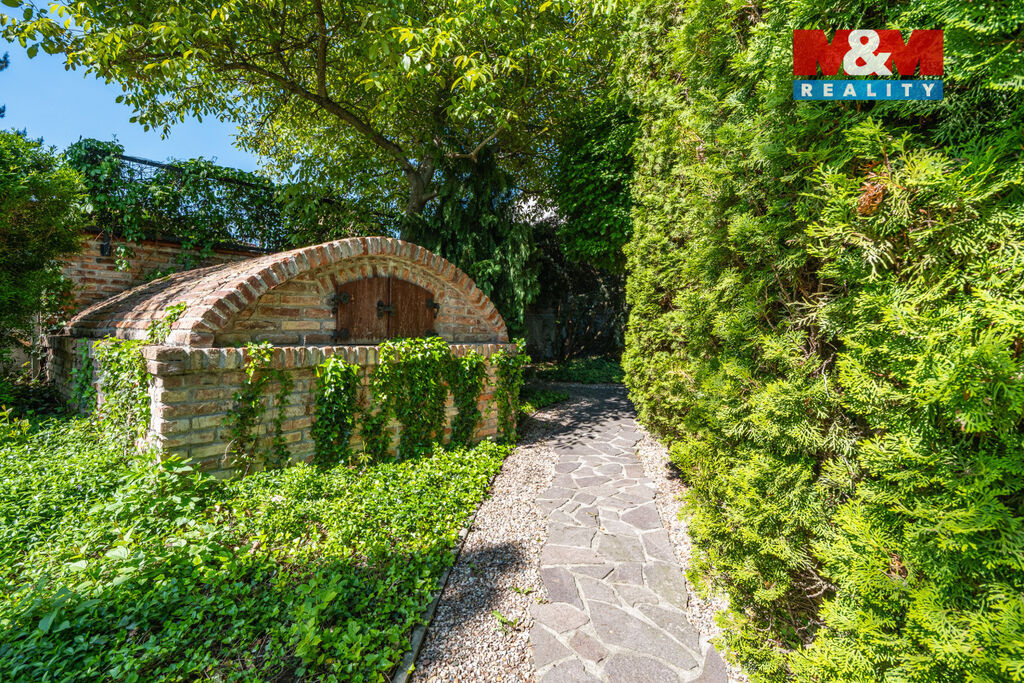 Nabízíme výjimečný rodinný dům 6+kk po zdařilé rekonstrukci, s okrasným pozemkem 1 927 m² a pouhých 15 min od Prahy. Součástí je také samostatný hostovský domek o dispozici 1+1 s podkrovím a garáží pro zahradní nářadí i motocykl. V 1. NP dominuje prosvětlený obývací pokoj s přímým vstupem na zahradu, kuchyně na míru od zn. Hanák s jídelním koutem, prostorná vstupní chodba, toaleta, pracovna a technická místnost. V 2. NP jsou tři ložnice, koupelna s toaletou, relaxační místnost s plynovým krbem a místem pro whirlpool. Dům je klimatizovaný, napojen na centrální vysavač a je zde bezpečnostní systém Jablotron. Vytápění domu zajišťuje plynový kotel. Unikátní, členitá zahrada nabízí absolutní klid a nadstandardní zázemí – krytý bazén 8×4 m se slanou vodou, zahradní kuchyni s grilem, neodolatelný vinný sklípek, zahradní domek s udírnou, sportovní hřiště, automatické zavlažování Hunter, jezírko s filtrací a dalších zajímavých detailů.