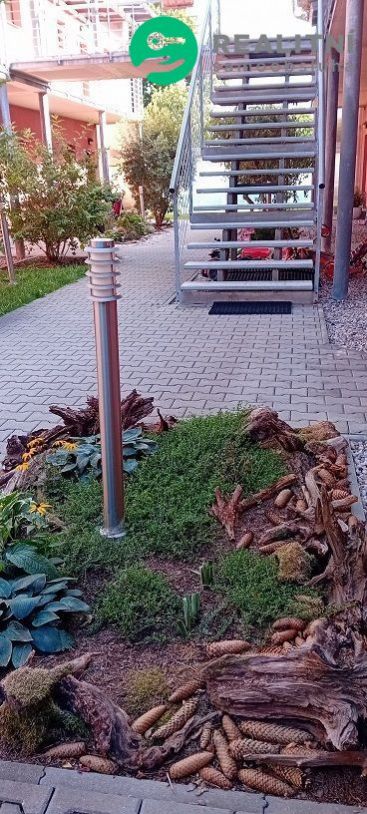 Byt je součástí dvou domků, které vytvářejí útulný dvorek. Cestička lemovaná okrasnými keři vás zavede k blankytnému bazénu. Vedle něj najdete houpačky, klouzačku, pískoviště, trampolínu i pergolu se zahradním posezením, grilem a lednicí ideální místo pro sousedská setkání.