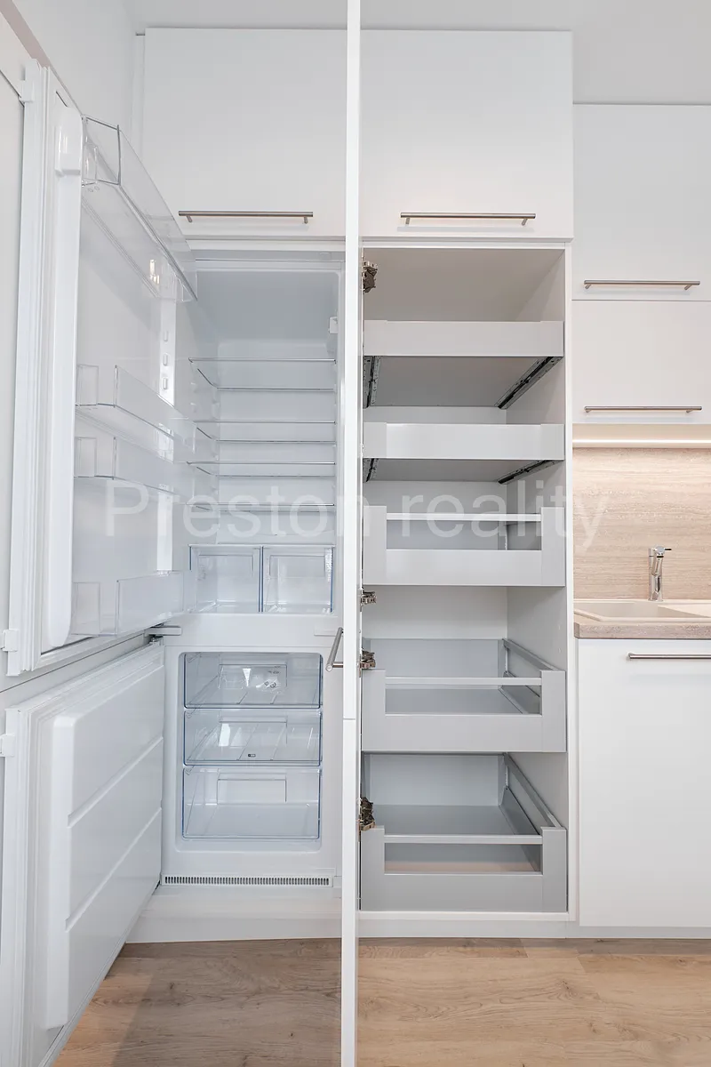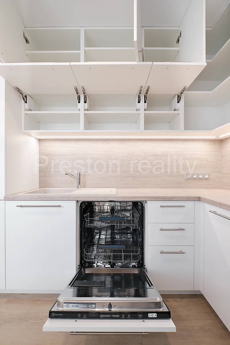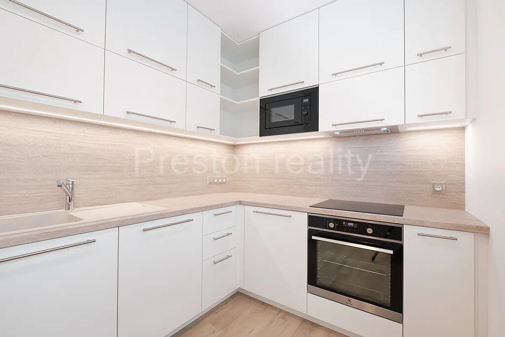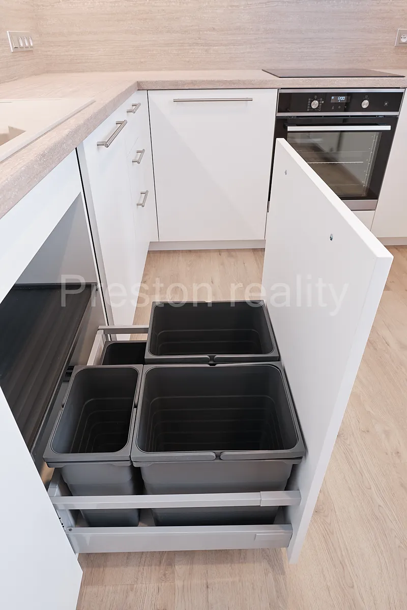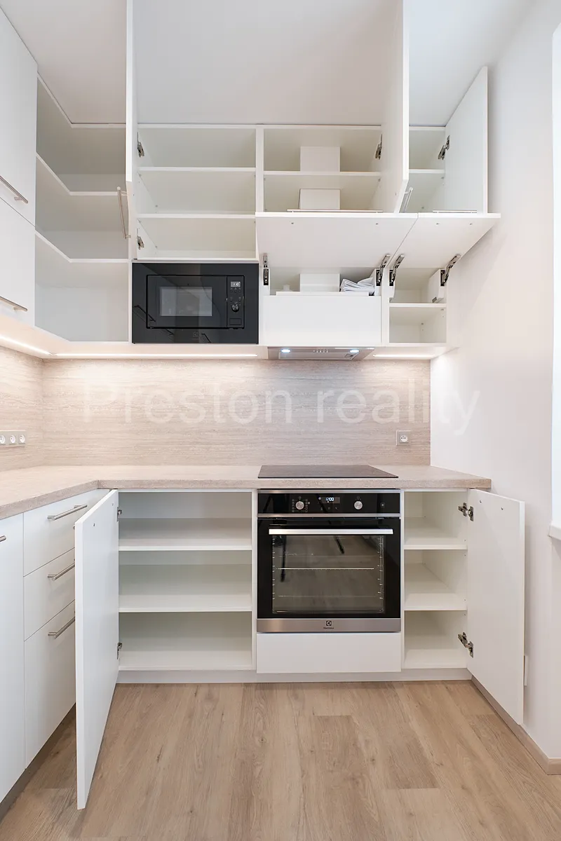 Byt je po náročné rekonstrukci se skládá ze dvou neprůchozích samostatných pokojů (16 a 19 m2). Menší pokoj (ložnice) je vybaven vestavěnou šatní skříní (šířka 200 cm). Z většího pokoje lze vstoupit do kuchyňského koutu, která je vybavena moderní kuchyňskou linkou se značkovými spotřebiči Electrolux: vestavná lednice (195 l) s mrazákem (72 l) s extrémně tichým chodem (pouze 35 dB), myčka nádobí (šířka 60 cm, s kapacitou 13 jídelních sad, A++), elektrická trouba s funkcí Steam Bake (pečení pomocí páry), sklokeramická indukční varná deska, mikrovlnná trouba (700W). Kuchyňská linka poskytuje velkorysé úložné prostory. Koupelna je vybavena velkým sprchovým koutem se zdvojenou sprchovou hlavicí (pevná a mobilní) a pračkou Electrolux PerfectCare 600 (6 kg prádla, 1.000 ot/min, hloubka 42 cm). WC je zvlášť. Orientace všech oken je na jižní stranu do tiché ulice Arménská. Na podlahách je položen moderní vinyl. K bytu je k dispozici také sklepní kóje.