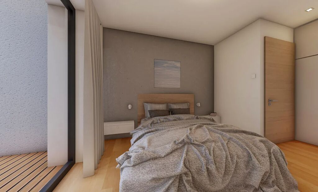 V 1.P.P jsou dvě ložnice se šatnami, koupelna a WC. Na ložnice navazuje terasa orientovaná jihovýchodním směrem do zahrady s výhledem na les.