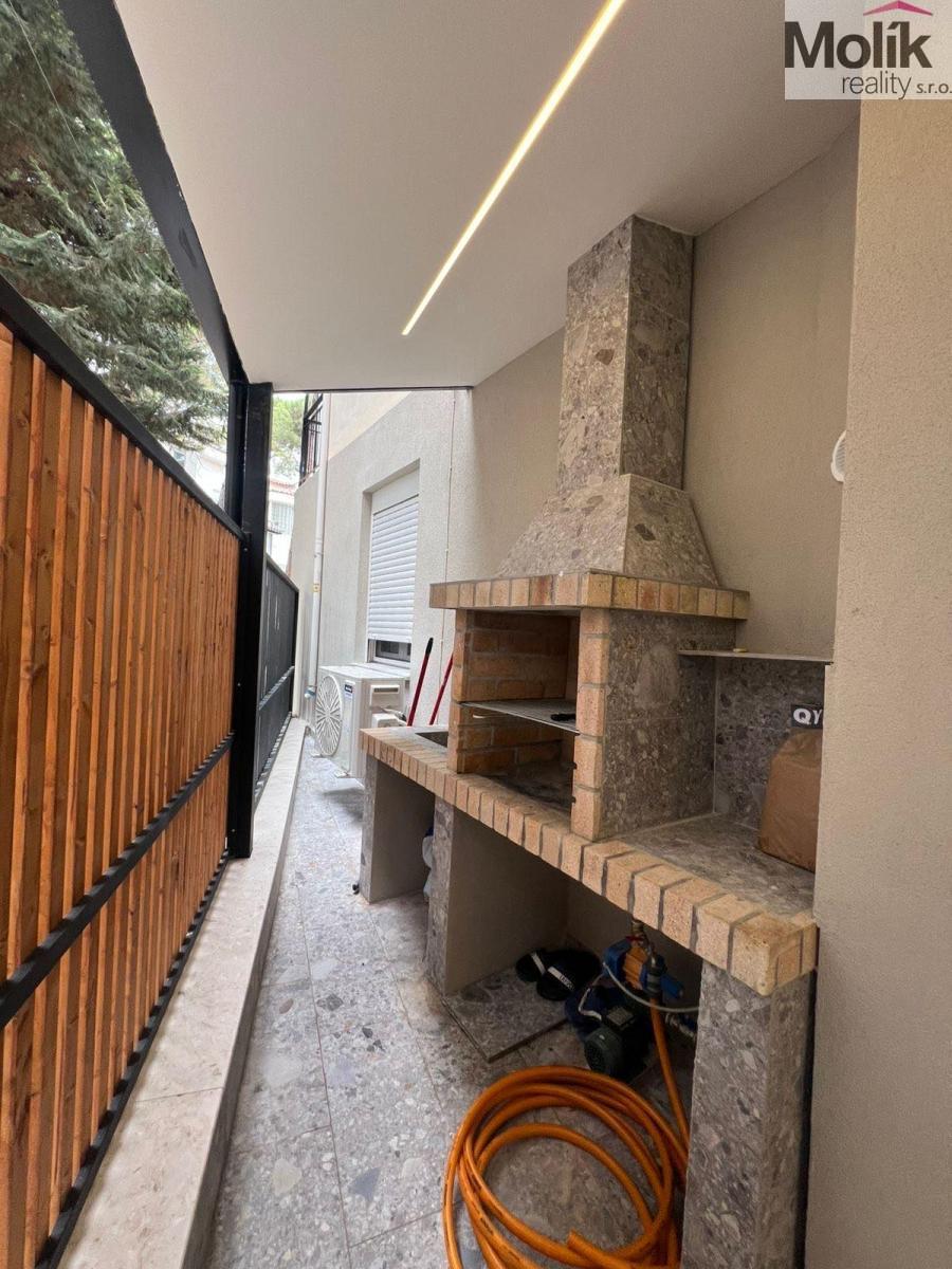 Exteriér / veranda: prostorná terasa s venkovním grilem a pracovní plochou z kamene ideální pro letní večery. Součástí je i připojení na vodu a dostatek úložného prostoru.