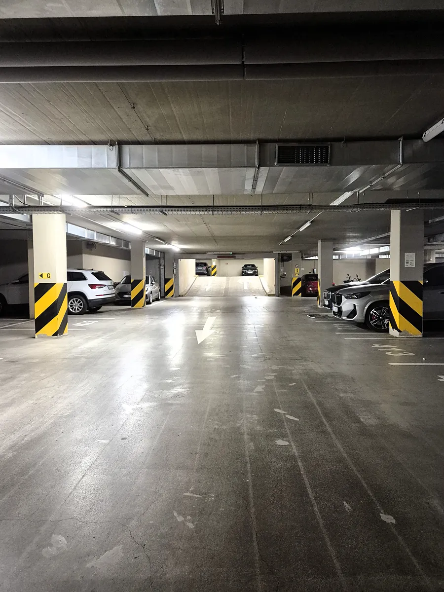 Parkovací stání se nachází ve 3.podzemním podlaží a má podlahovou plochu cca 13m2. Rozměry cca 2,4m x 5,5m.