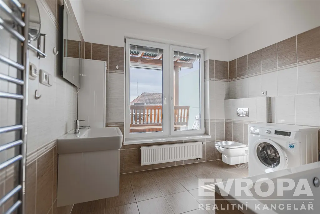 Koupelna je vybavena vanou, toaletou a oknem na terasu, k dispozici je i samostatná druhá toaleta a dvě komory – jedna přímo v bytě, druhá v mezipatře domu.