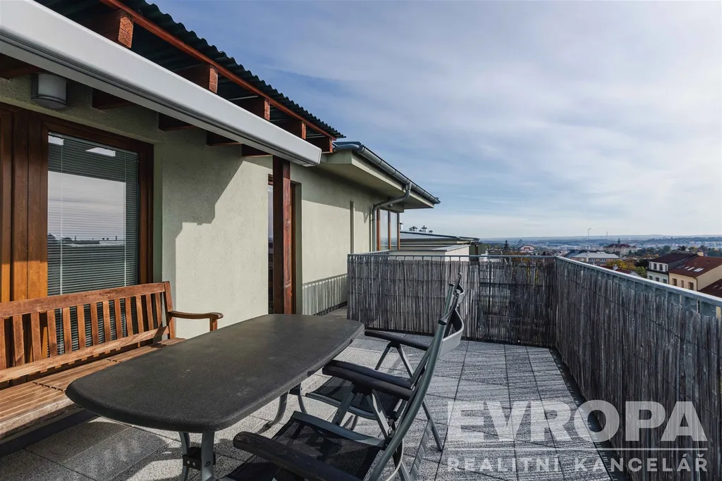 Terasa obklopuje celý byt a poskytuje panoramatický výhled na Prahu – ideální místo pro relaxaci, posezení s přáteli nebo klidné večery s výhledem na město.
