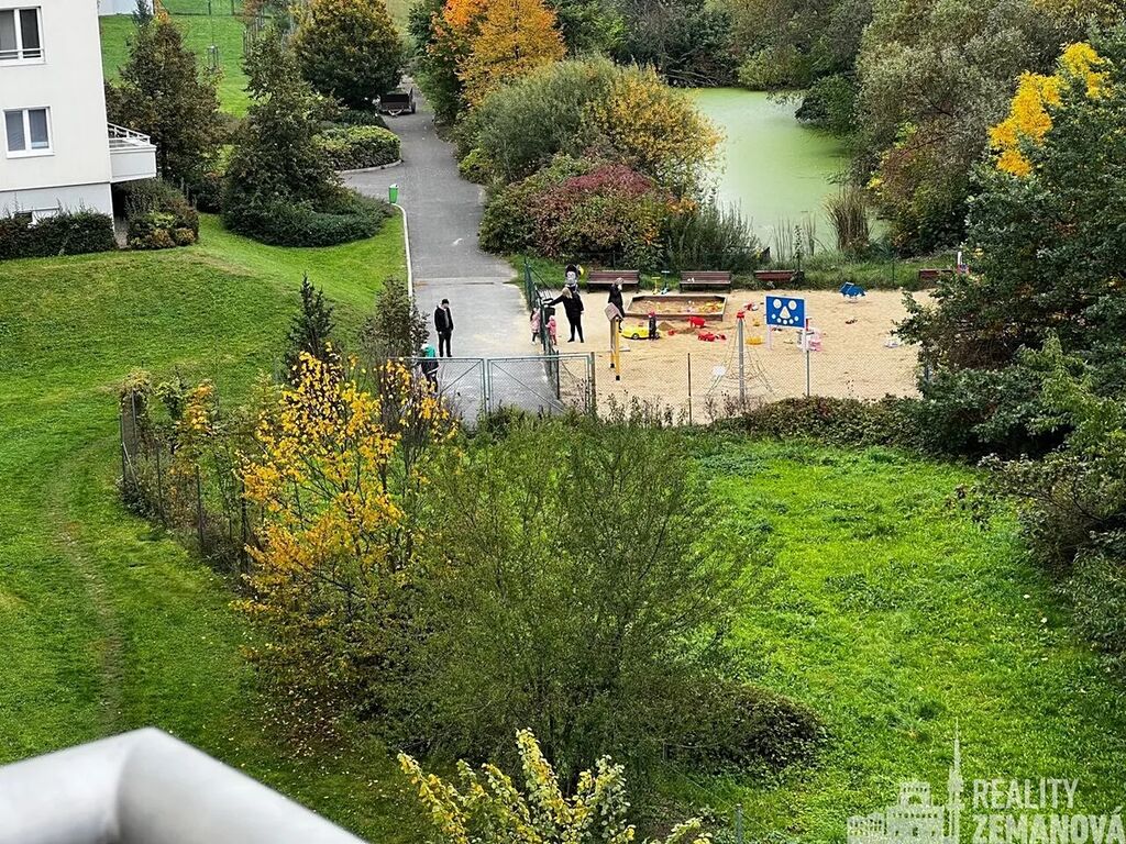 Výhled z obývacího pokoje a balkónu do zeleně a k dětskému hřišti. Naprostý klid.