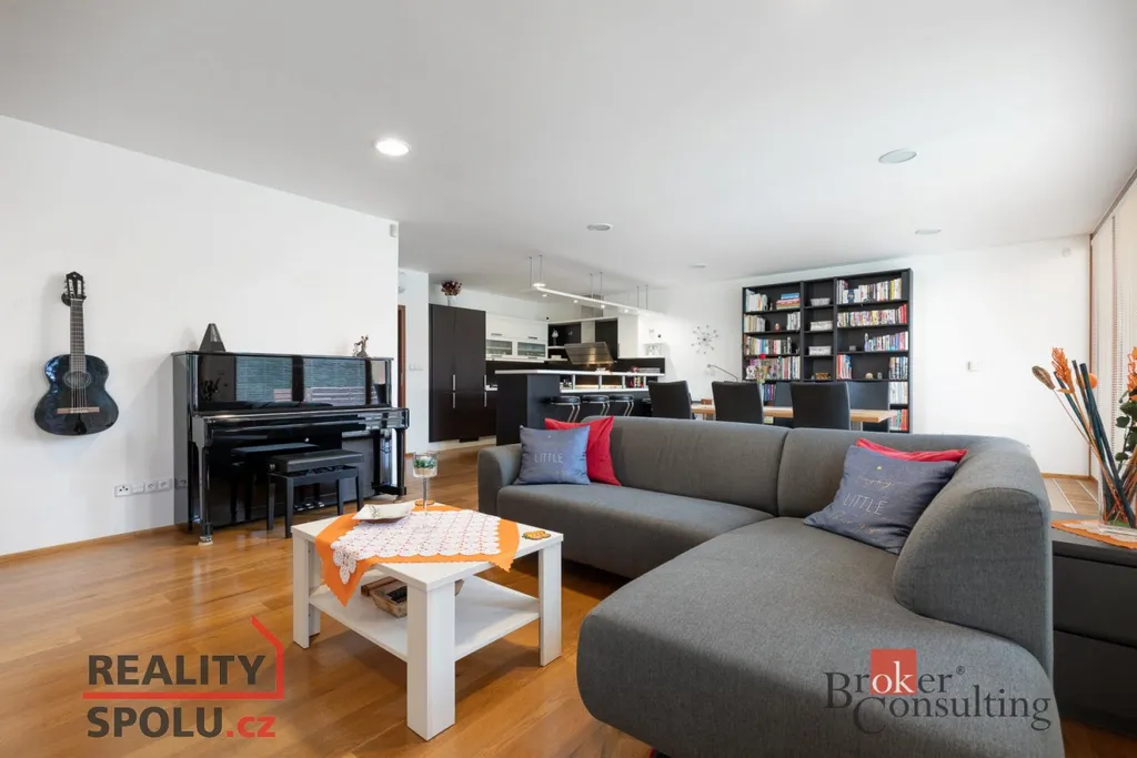 Dům je součástí trojdomku (řadovky). Část zahrady je využívána společně, další část je ve výhradním vlastnictví majitele a nabízí dostatek soukromí pro odpočinek či zahradničení. Parkování je zajištěno na pozemku před domem v uzavřeném areálu s vjezdovou bránou na dálkové ovládání, případně pohodlně v garáži, která je přímo součástí domu.
