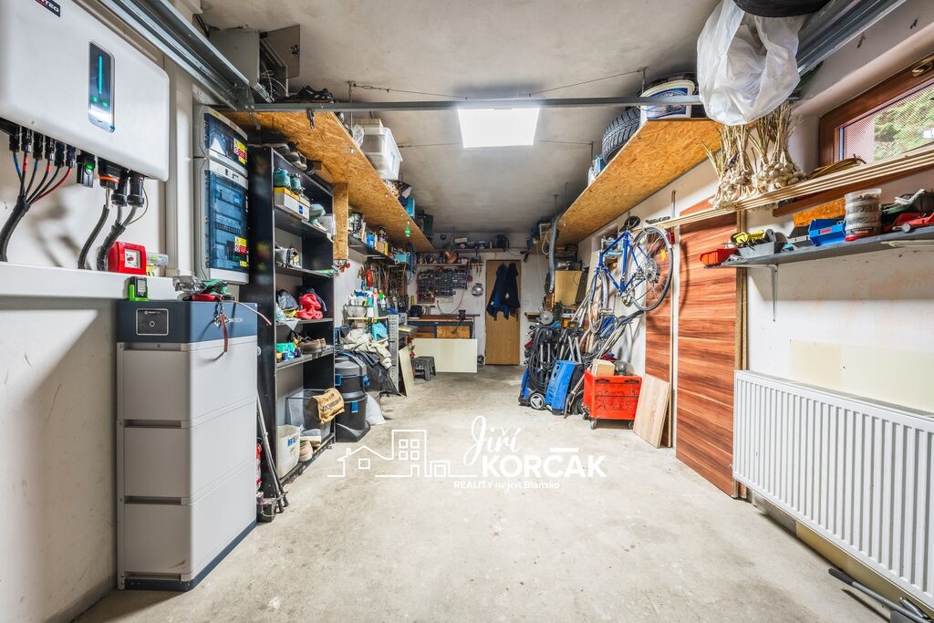 Před domem je vjezdová brána ke garáži s dalším parkovacím místem, nechybí ani samostatný vjezd ke dřevníku.