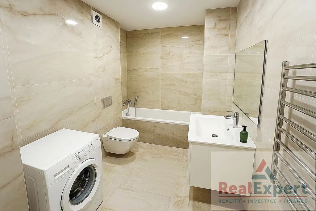 Byt ve 2. nadzemním podlaží má předsíň s vestavnou šatní skříní, koupelnu s vanou a WC a obytnou místnost s kuchyňským koutem a vstupem na balkon. Kuchyňská linka je vybavena varnou deskou, pečící troubou, digestoří, vestavnou lednicí s mrazákem. Na podlahách je velkoformátová dlažba. K bytu náleží i sklep v přízemí domu.