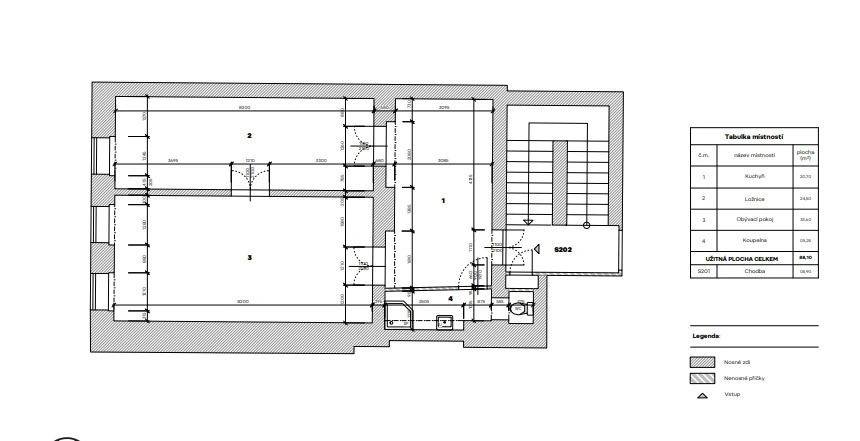 Celková výměra jednotky činí 88,1 m2, dispozice 2+1. Byt je umístěn ve druhém nadzemním podlaží budovy. Jednotka je vybavena novou kuchyňskou linkou se spotřebiči – varná deska, trouba, lednička, myčka.