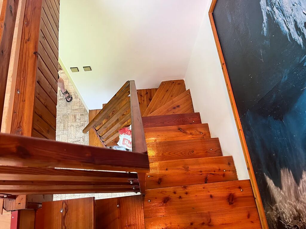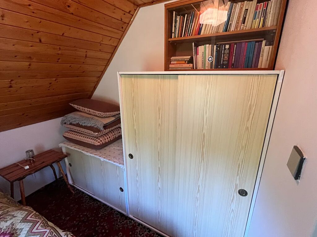 Dispozičně: V přízemí: vstupní zádveří, obývací pokoj s krbovými kachlovými kamny a se vstupem na krytou prostornou slunečnou terasu s průsvitnou střechou a výhledem do zahrady, neprůchozí pokoj - ložnice a samostatná kuchyně s dřevěným schodištěm do obytného podkroví, koupelna s WC + sprchový kout. V patře: 2 neprůchozí pokoje - velká ložnice s balkonem a koutem s umyvadlem + menší neprůchozí dětský pokoj či jako pracovna. Dále se sklopným žebříkem můžeme dostat na půdní úložné prostory. V přízemí je vstup do samostatné komory - sklepa pro uložení zahradní techniky, nářadí či uskladnění ovoce.