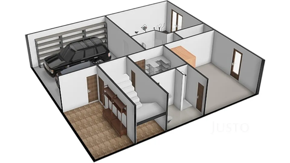 V přízemí se nachází velkorysá vstupní hala (12,3 m²), dodává celému interiéru vzdušný ráz. Hala navazuje přímo na garáž (33 m²)pro dva osobní vozy. K dalšímu ev. parkování poslouží zpevněná plocha před garáží. Další části přízemí je posilovna (21,9 m²), místnost se saunou (17,2 m²), která je s vlastním sprchovým koutem a toaletou. Z obou těchto místností lze vyjít na zahradu s bazénem. Místnost se saunou by bylo možné upravit k trvalému bydlení nebo případně k využití pro drobné podnikání. Technická místnost (6,5 m²) tč. slouží jako spíž a úložné prostory.