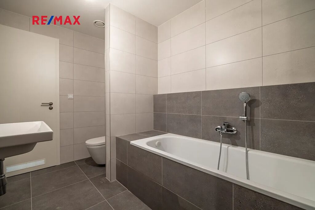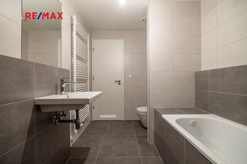 Koupelna je elegantně řešená, s velkoformátovou dlažbou, moderní sanitou a přípravou na pračku.