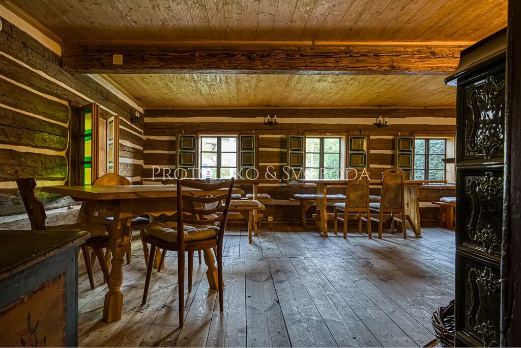 Dominantou domu je velká společenská místnost v tradičním roubeném stylu s kachlovými kamny a výčepem – srdce domova, kde se schází rodina i přátelé. K domu náleží pečlivě udržovaná zahrada s grilem, krbem a krytým venkovním posezením. Děti potěší trampolína, pískoviště i bazén, dospělí zase naleznou klid v šumu stromů a vůni lesa.