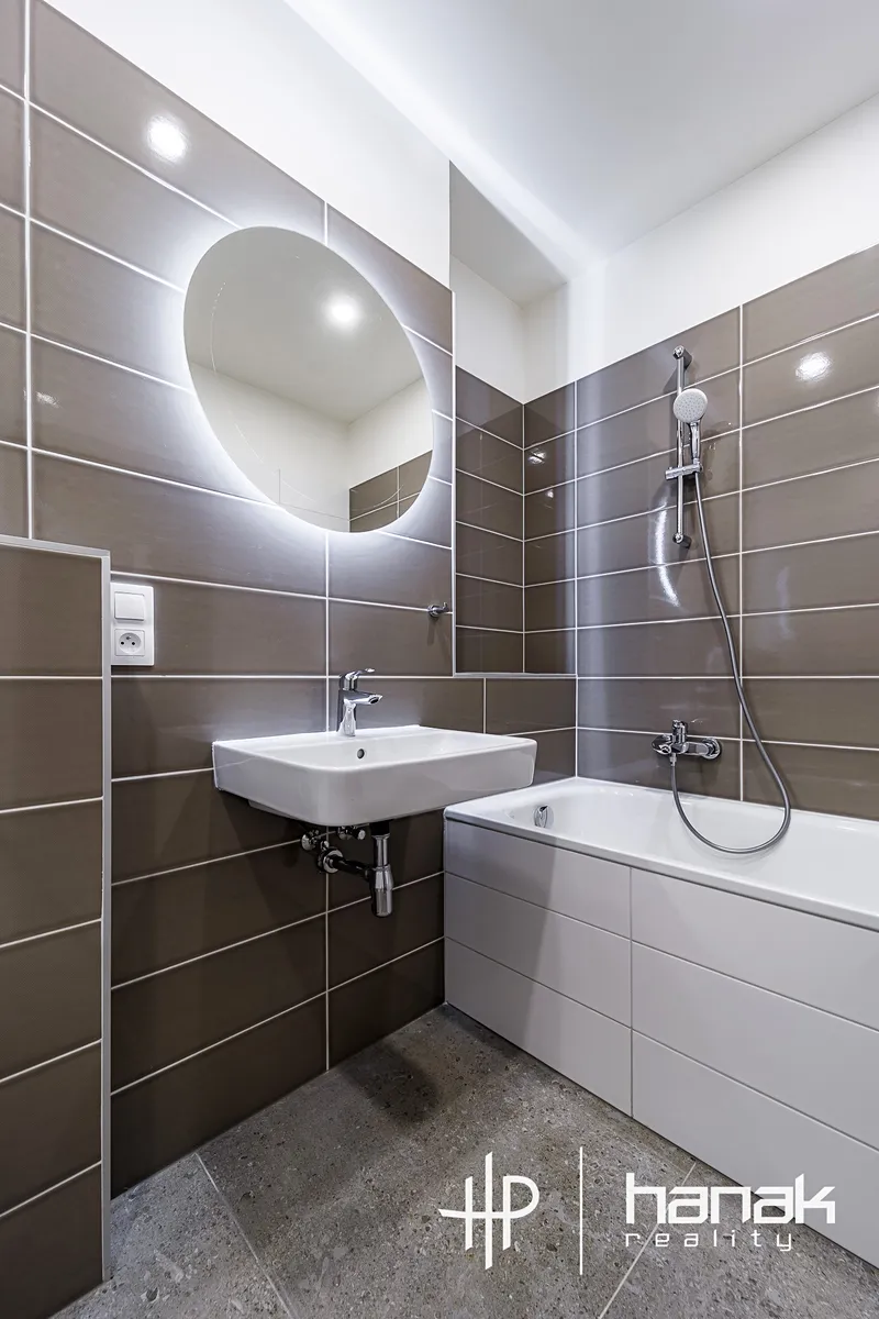 Byt má vysoký standard. Obklady i zařizovací předměty v koupelně jsou značky VilleroyBoch.