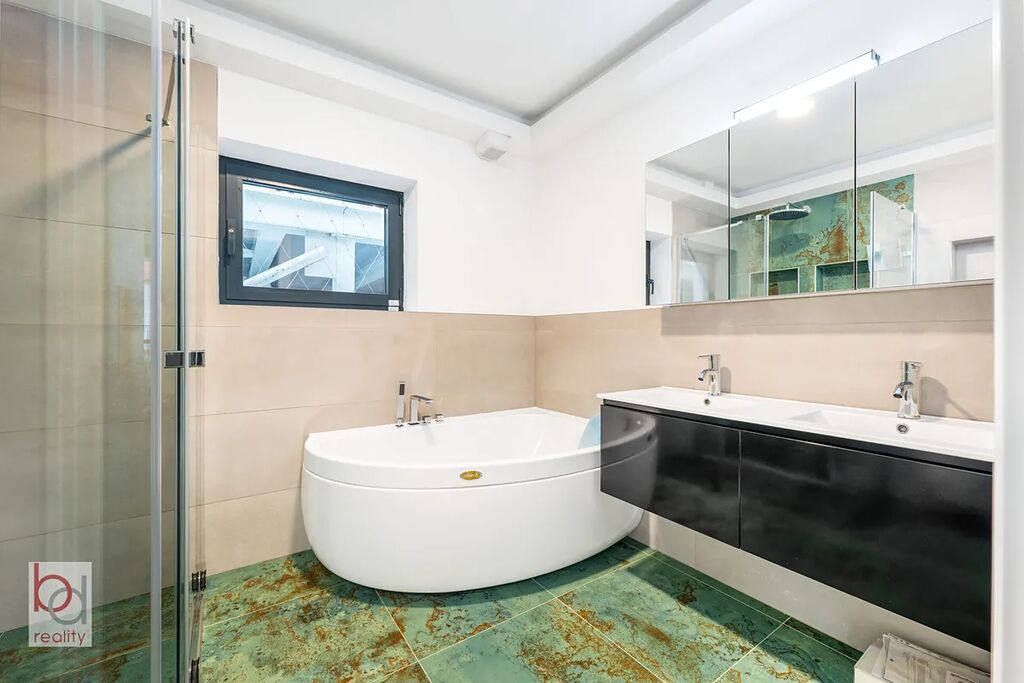 Koupelna vybavena vanou a sprchovým koutem, umyvadlo, zrcadlo, WC. Šatna vybavena vestavným nábytkem s policovým systémem. Celkový perfektní dojem pak podtrhují dubové podlahy, předokenní žaluzie na všech oknech, podlahové vytápění ve všech místnostech, kamenná dlažba, sádrové omítky a mnoho ostatních - nadstandardně kvalitních prvků, které dotváří luxusní dojem celého bydlení. K dispozici od 01.01.2026. Krásné bydlení v centru města. Byt je vybaven klimatizací.