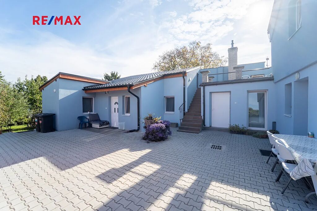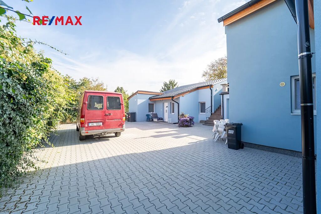 Zastavěná plocha a nádvoří domu o velikosti 358 m2 je osazeno zámkovou dlažbou a umožňuje vjezd na pozemek přímo z ulice Legionářů