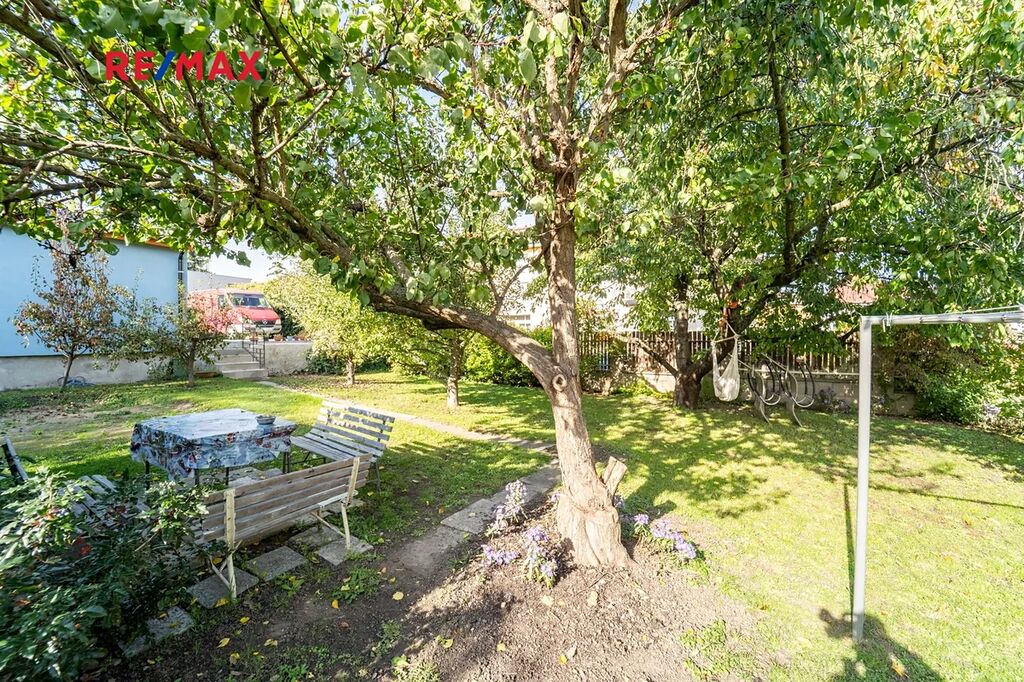 Zahrada u domu o velikosti 303 m2 poskytuje klid a útočiště s posezením pod ovocnými stromy vedle zahradního domku, díky němuž máte kam uklidit vše potřebné pro její údržbu.