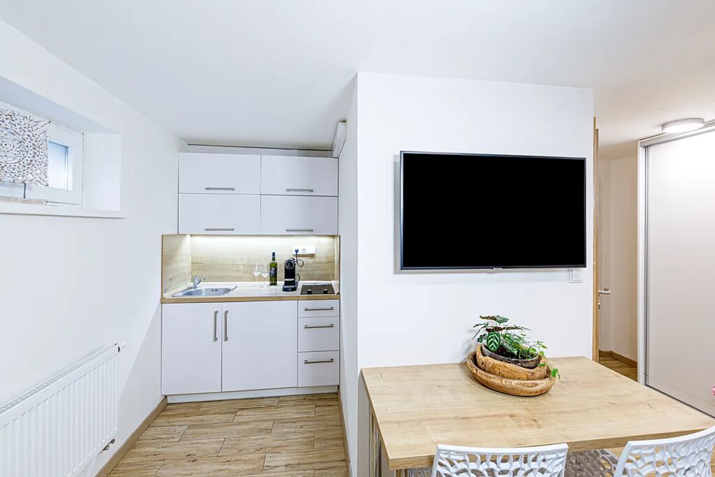 Dispozice a vybavení bytu: Kuchyňský kout s varnou deskou a lednicí. Koupelna se sprchovým koutem a WC. Dále je v pokoji skříň, stůl, křesílko, Smart TV, postel s kvalitní matrací, přikrývkou, polštářem a povlečením.