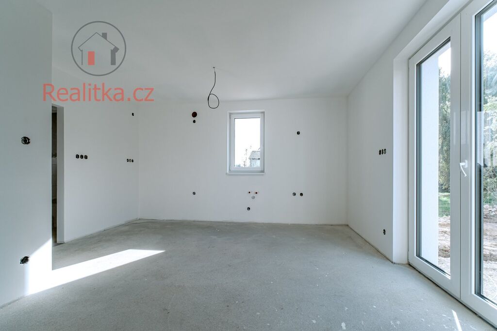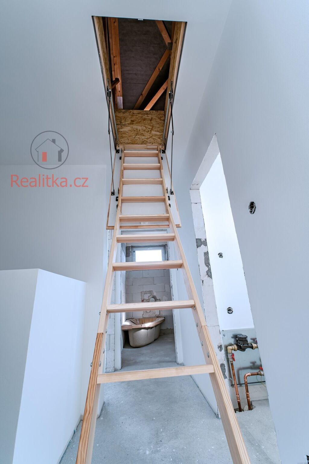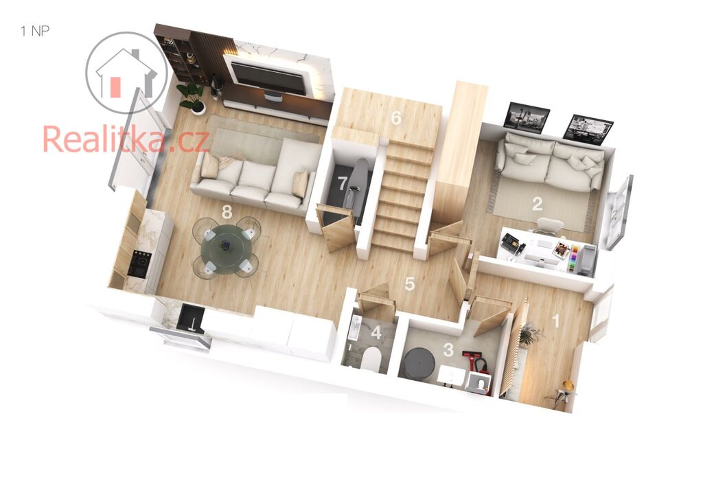 • Přízemí: Přivítá vás prostorná chodba, technická místnost, elegantní WC s geberitem, útulný pokoj, praktická komora pod schody a moderní kuchyň spojená s obývacím pokojem, odkud je vstup na terasu.